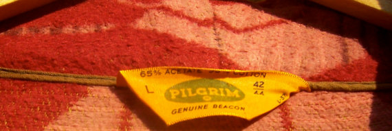 The seller provided a close up of the label which identifies it as a “Genuine Beacon” robe. The pattern name may be “Pilgrim.” It may have been manufactured in the 1940s or 1950s.