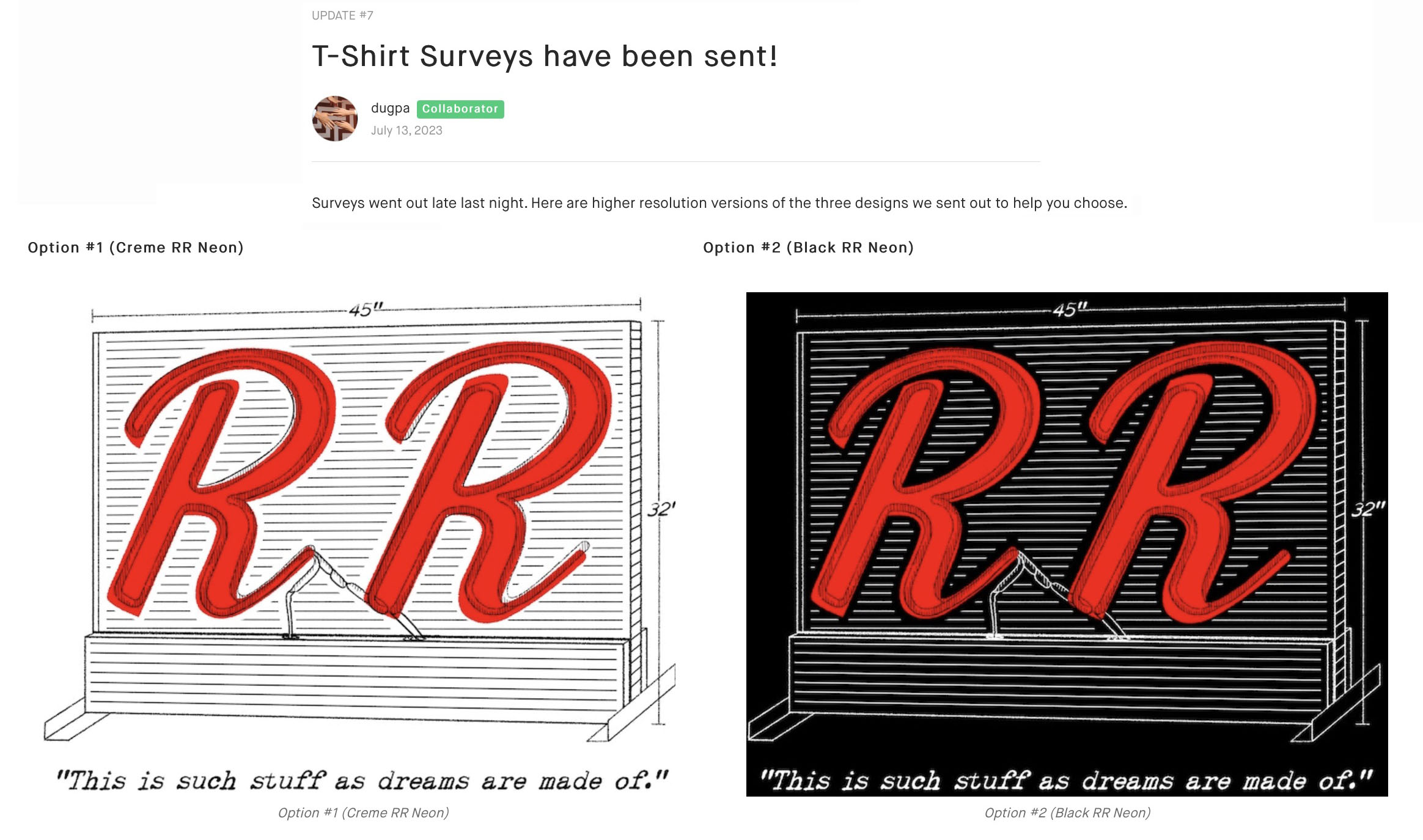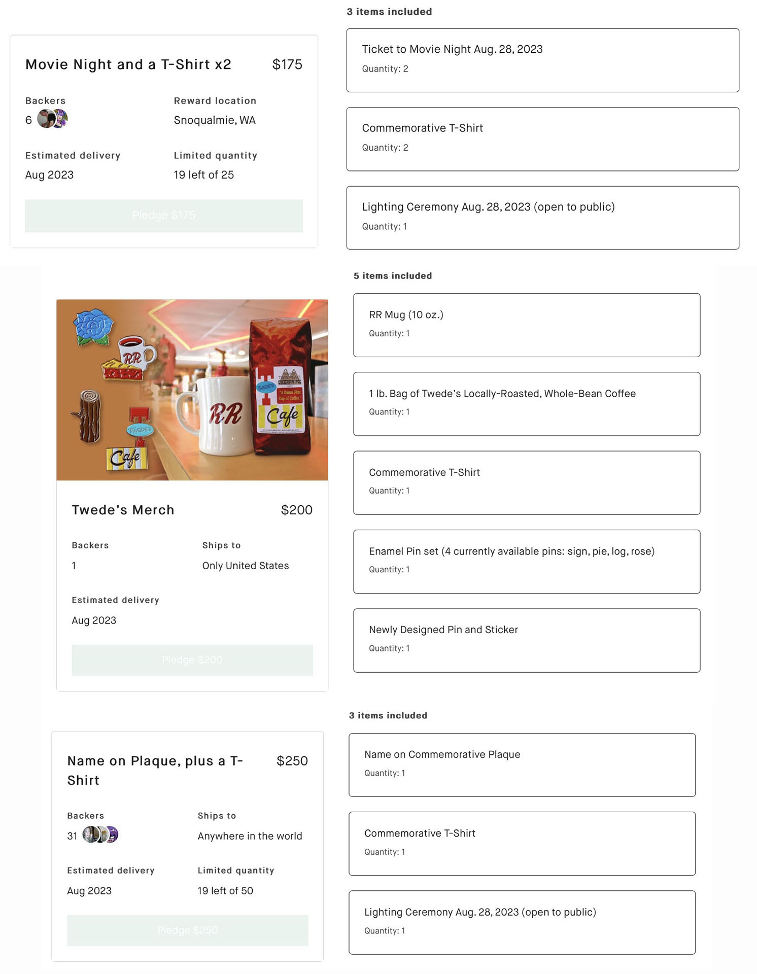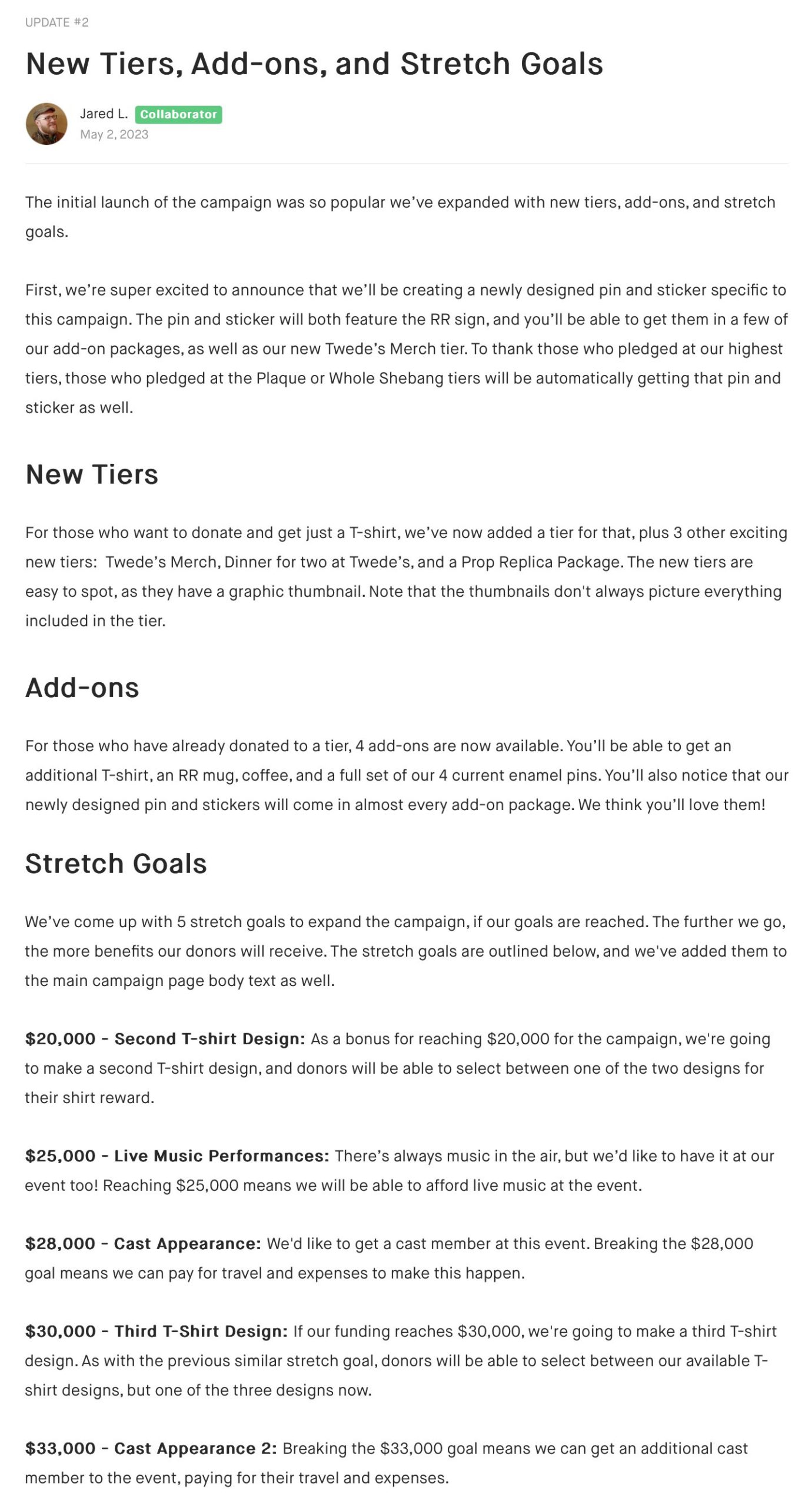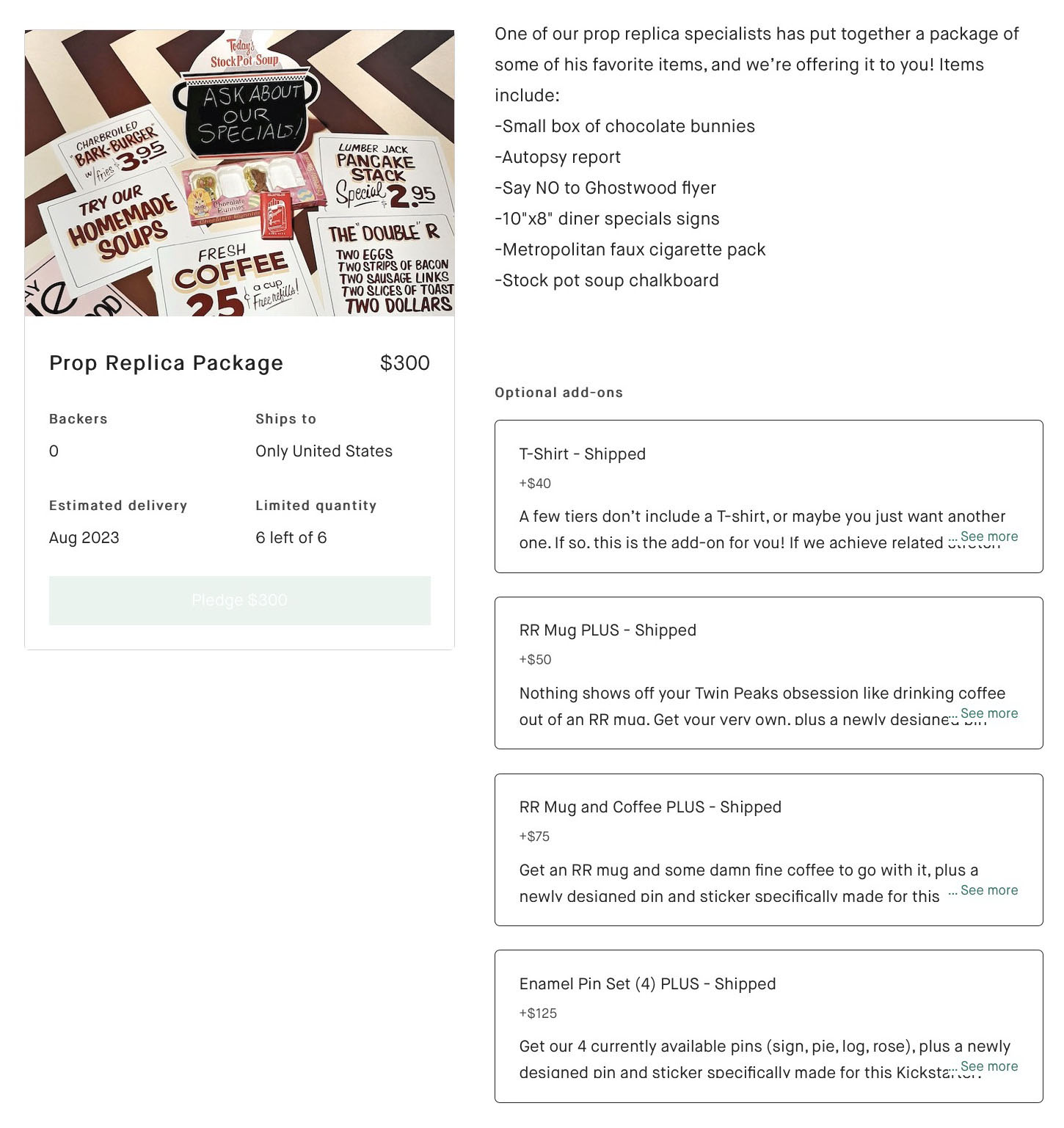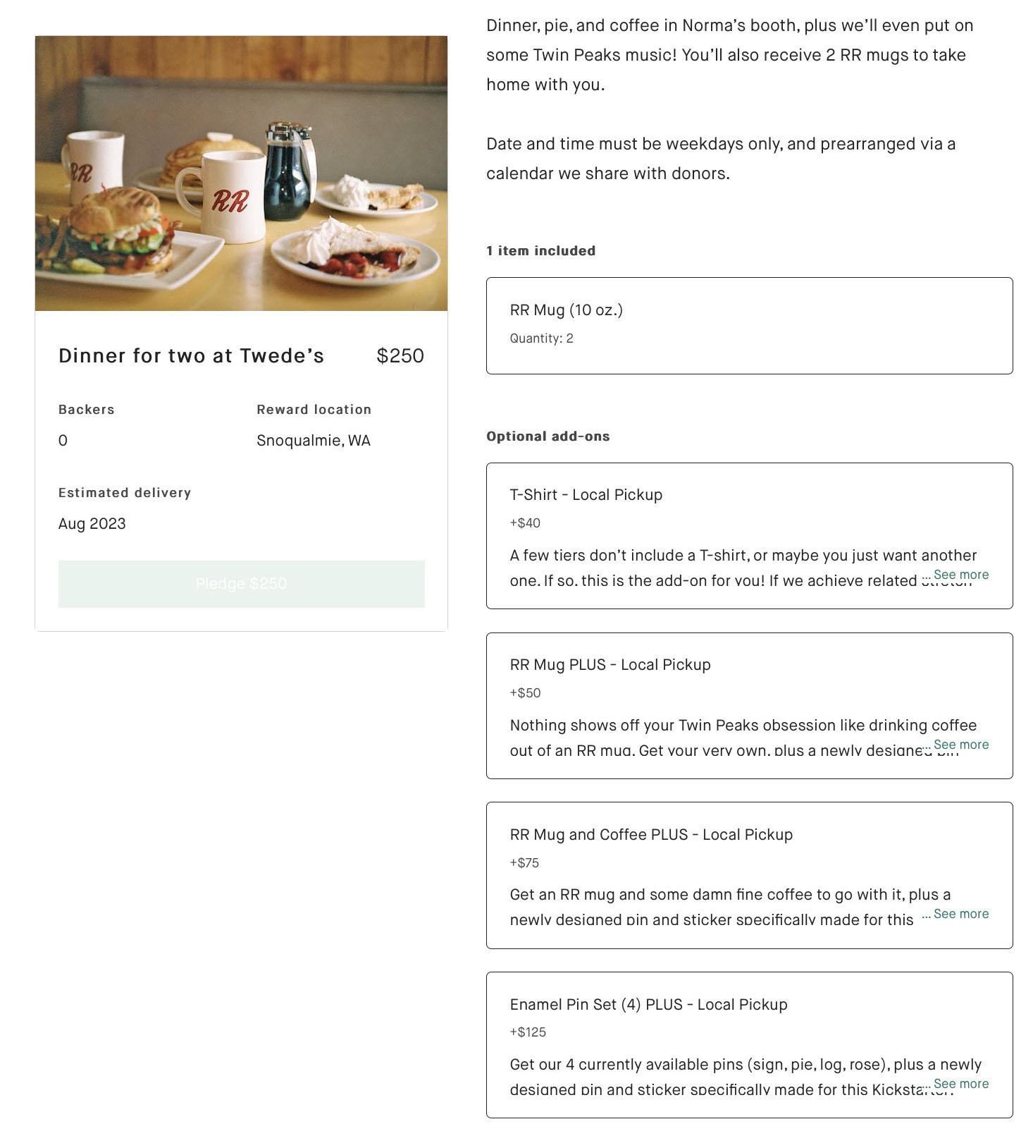 • May 2, 2023 – Creating newly designed pin and sticker specific to the campaign. New tiers introduced including the t-shirt only option and three additional options – Twede’s Cafe merchandise, dinner for two at Twede’s Cafe,  and a replica prop package. Also added four add-ons for those who already donated to the campaign – t-shirt, RR mug, coffee, and full set of four existing enamel pins. Finally, added five stretch goals from $20,000 to $33,000.