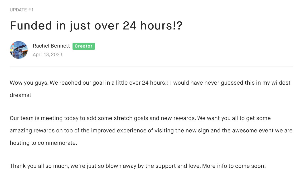 • April 13, 2023 – Campaign reached its goal in a little over 24 hours.