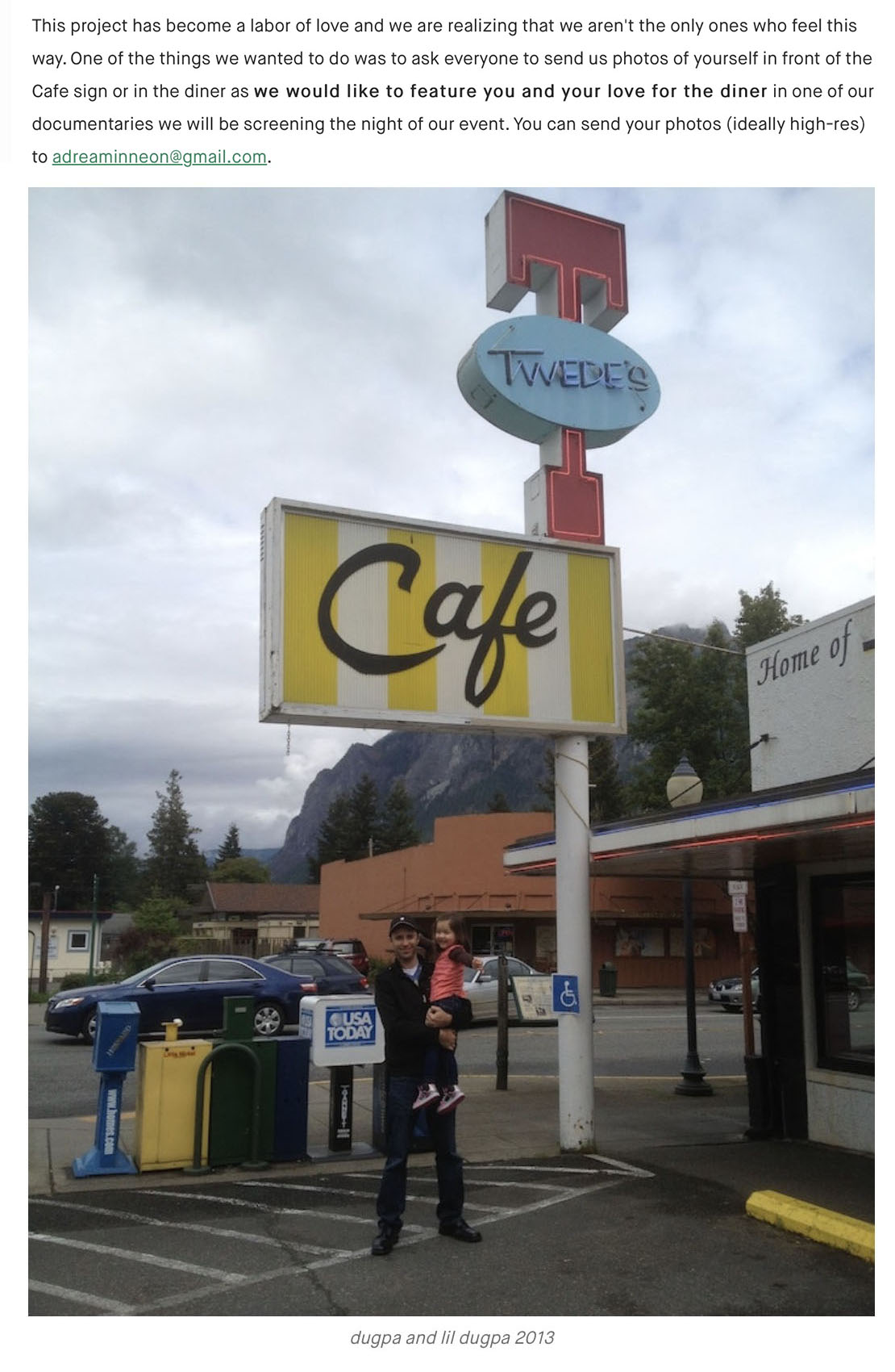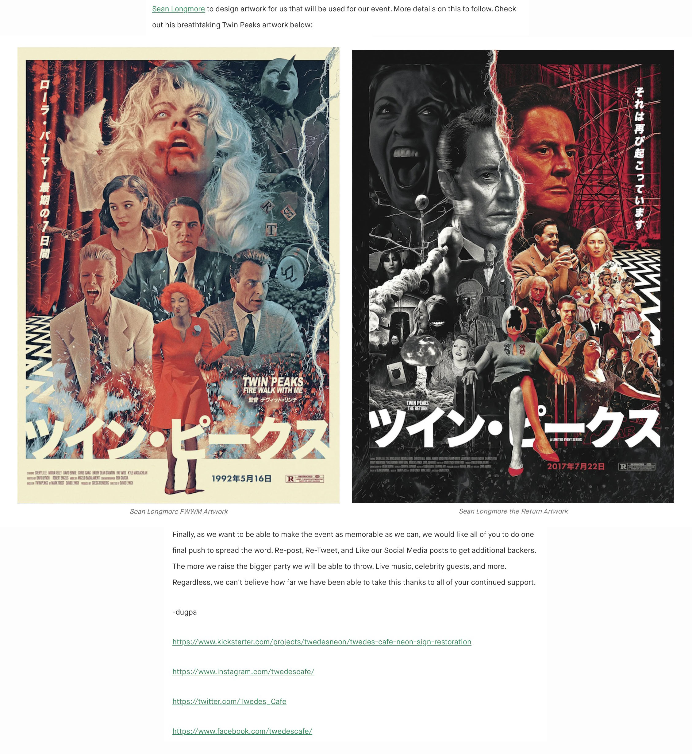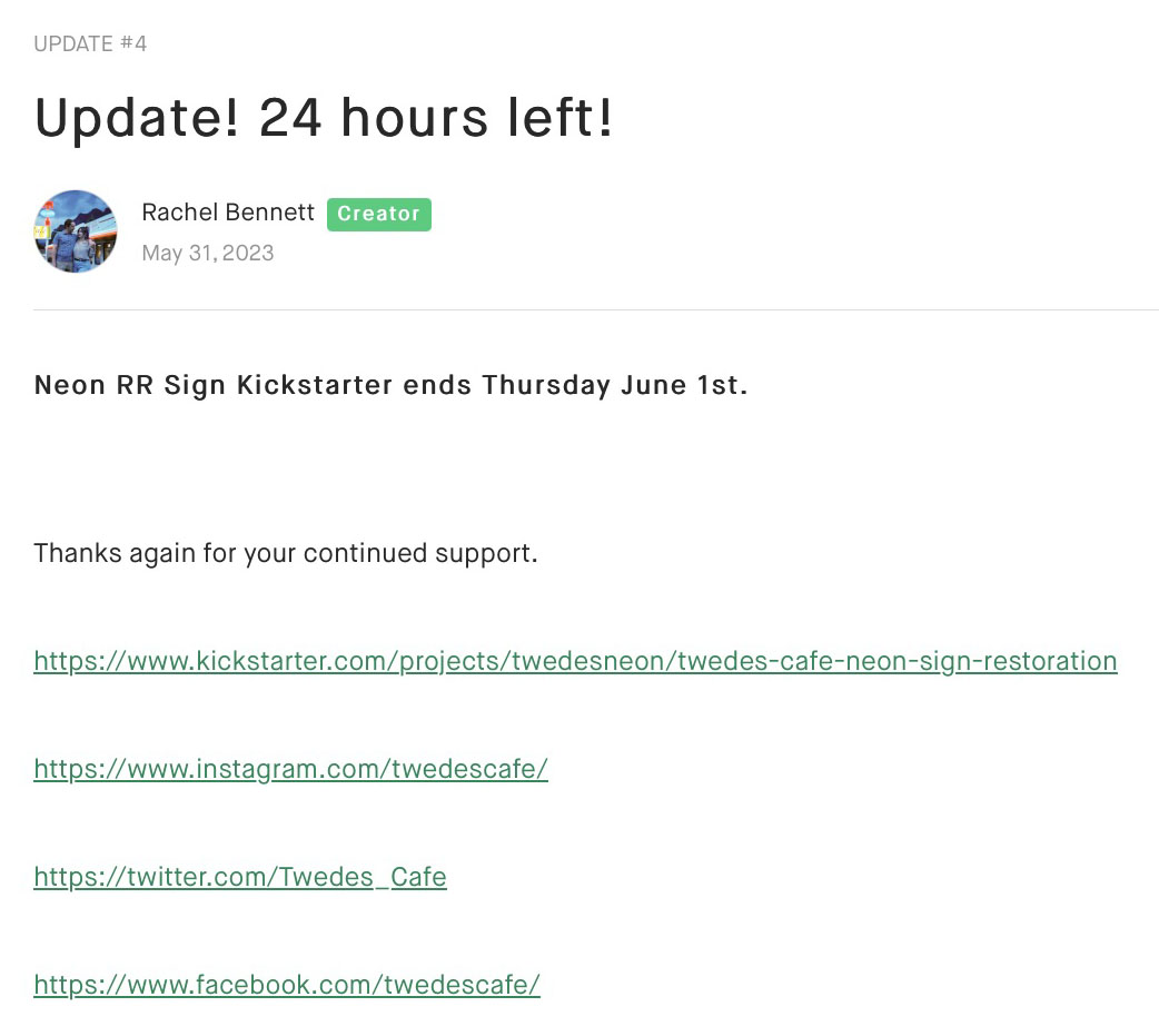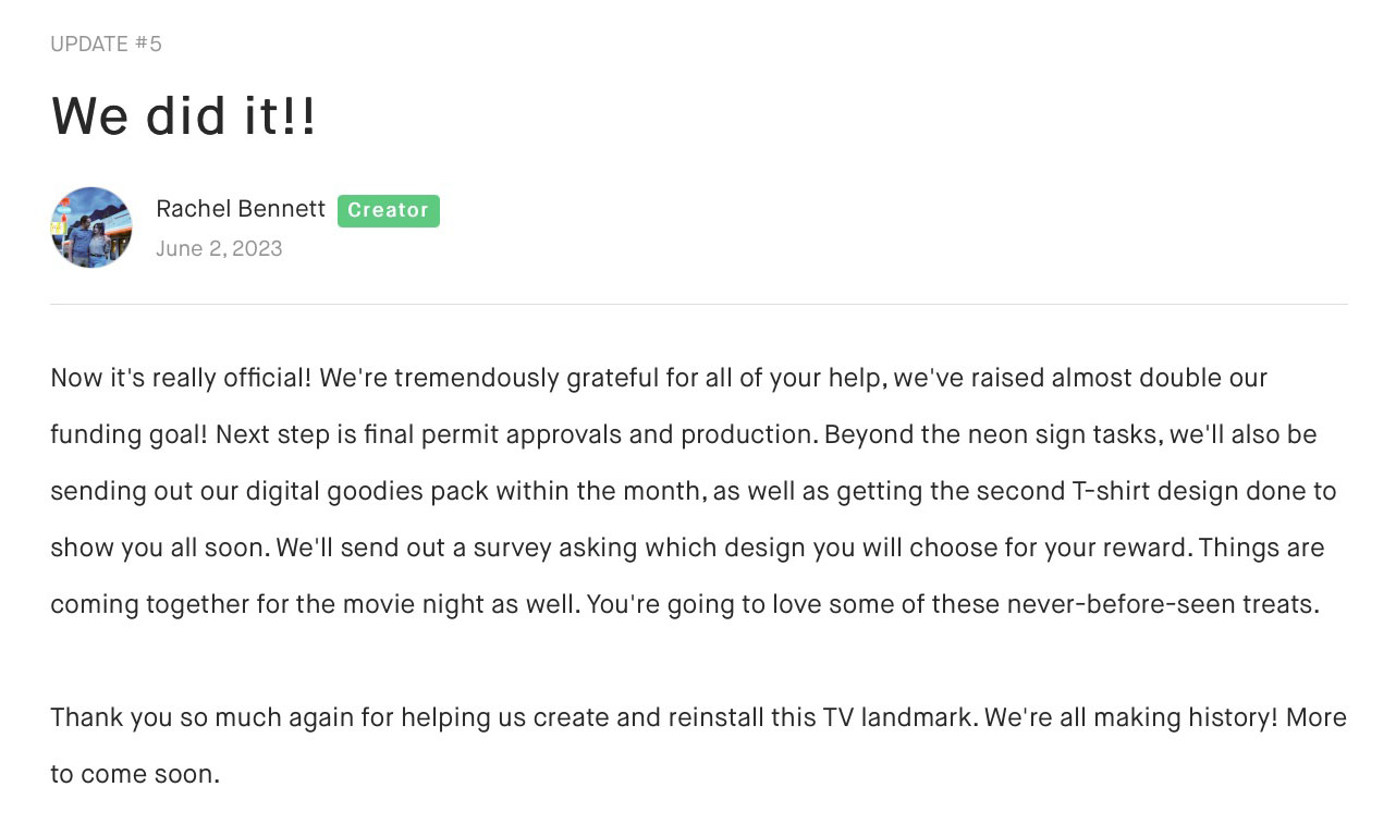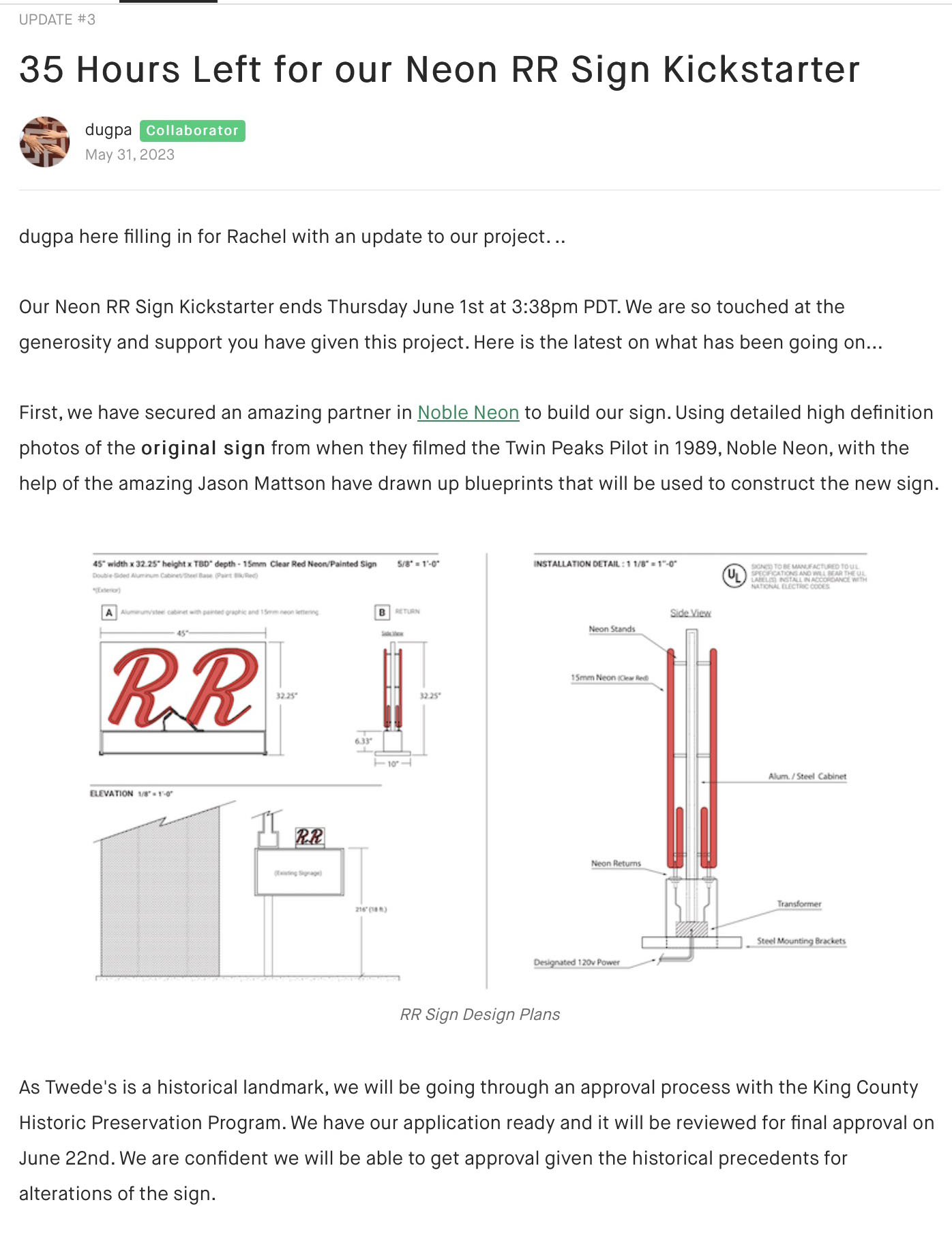 On April 10, 2023, Rachel from Twede’s Cafe launched the Kickstarter campaign with a goal of raising $15,000 by June 1. The campaign would “return the neon RR sign to its rightful place as it was while filming Twin Peaks.” There would also be a movie night, lighting celebration and more.