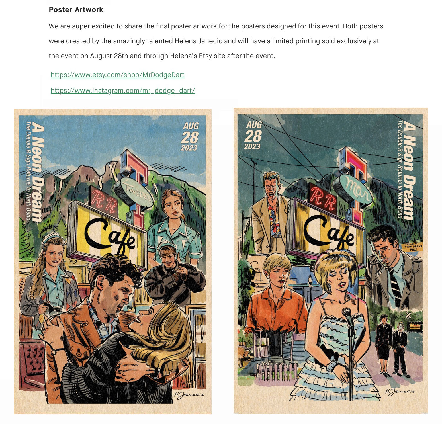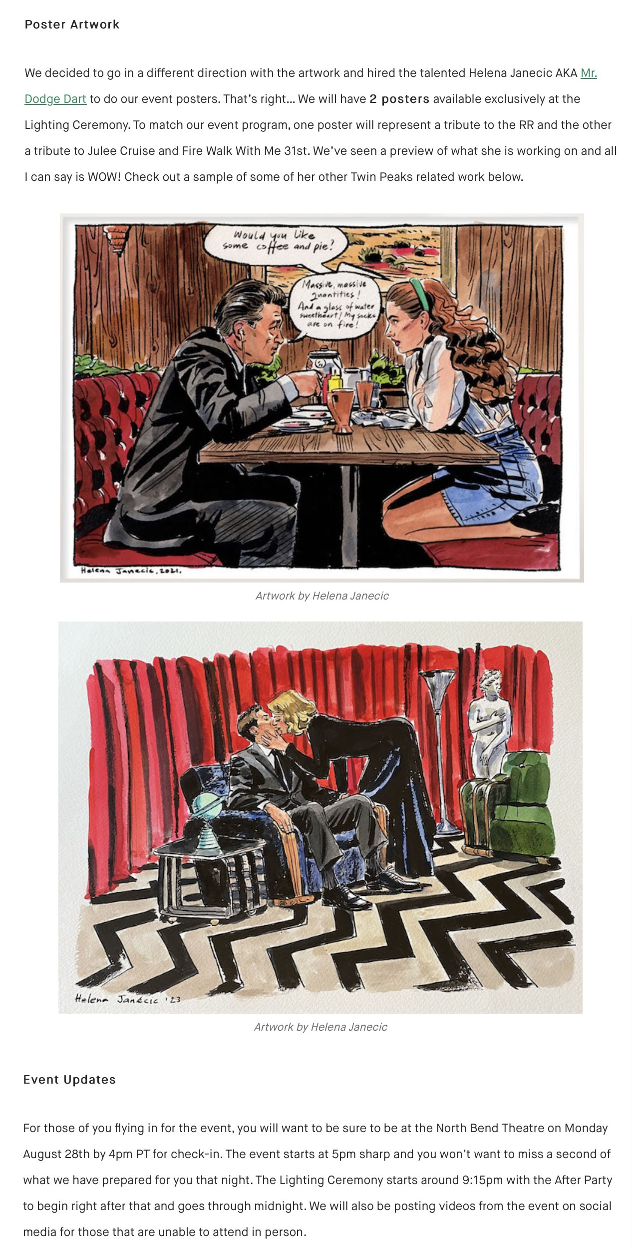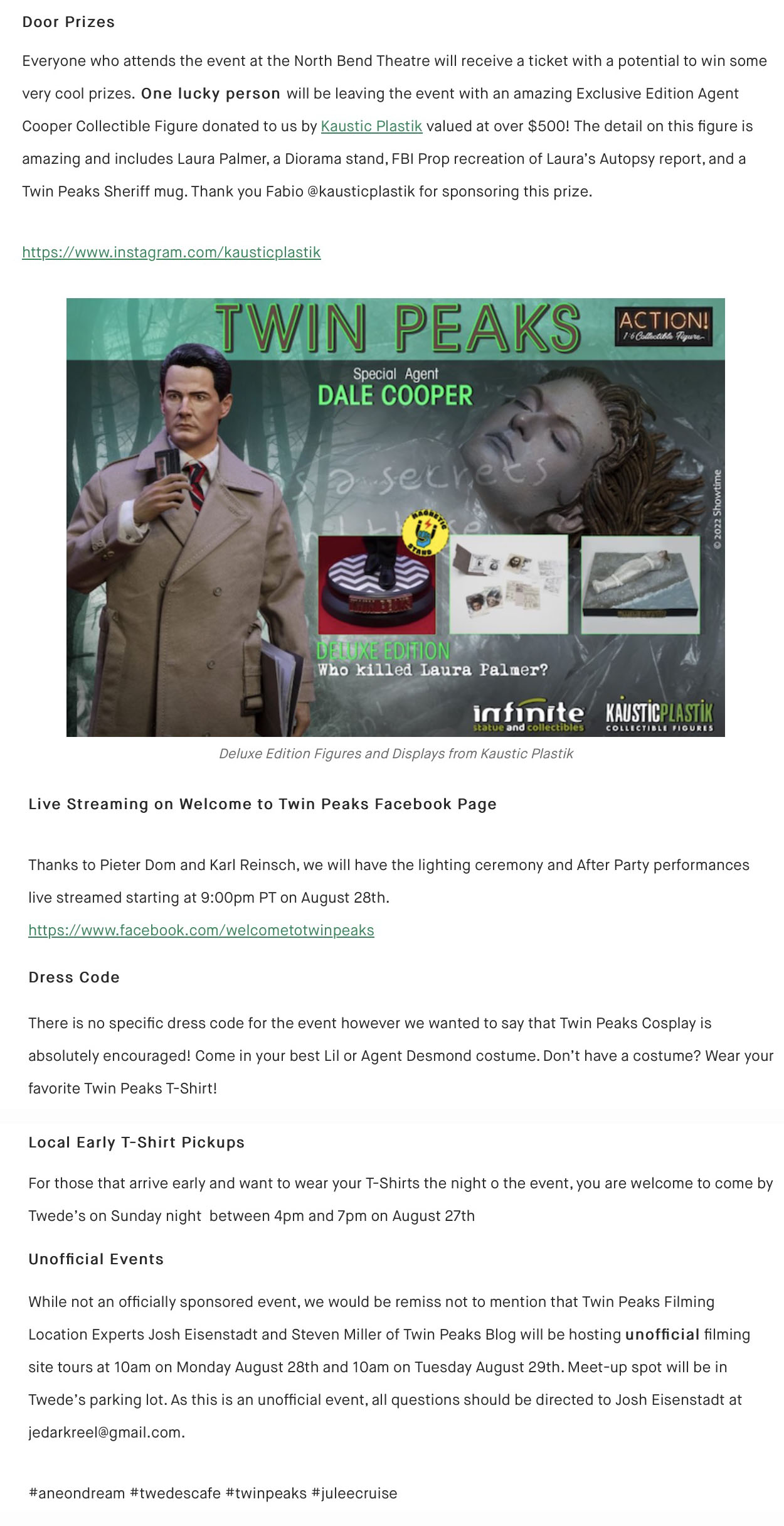 • August 17, 2023 – Shared first look at sign from Noble Neon. Shared final look at two posters created for the event by Helena Janecic. Announced “Julee Cruise – A Recorded Night in the Woods” would be shown at the movie event on August 28. This was a 2002 recording of Julee performing a the Twin Peaks Fan Festival with sound remastered by Twin Peaks Sounds (Matthew Haywood). Also announced an expanded documentary about Twin Peaks: Fire Walk With Me would be shown. Kaustic Plastik is donating Agent Cooper Collectible figure for door prize drawing. The event would also be streamed live via Welcome to Twin Peaks Facebook page. Josh Eisenstadt and Steven Miller would offer film location tours on August 28-29 at 10:00 a.m. each day.