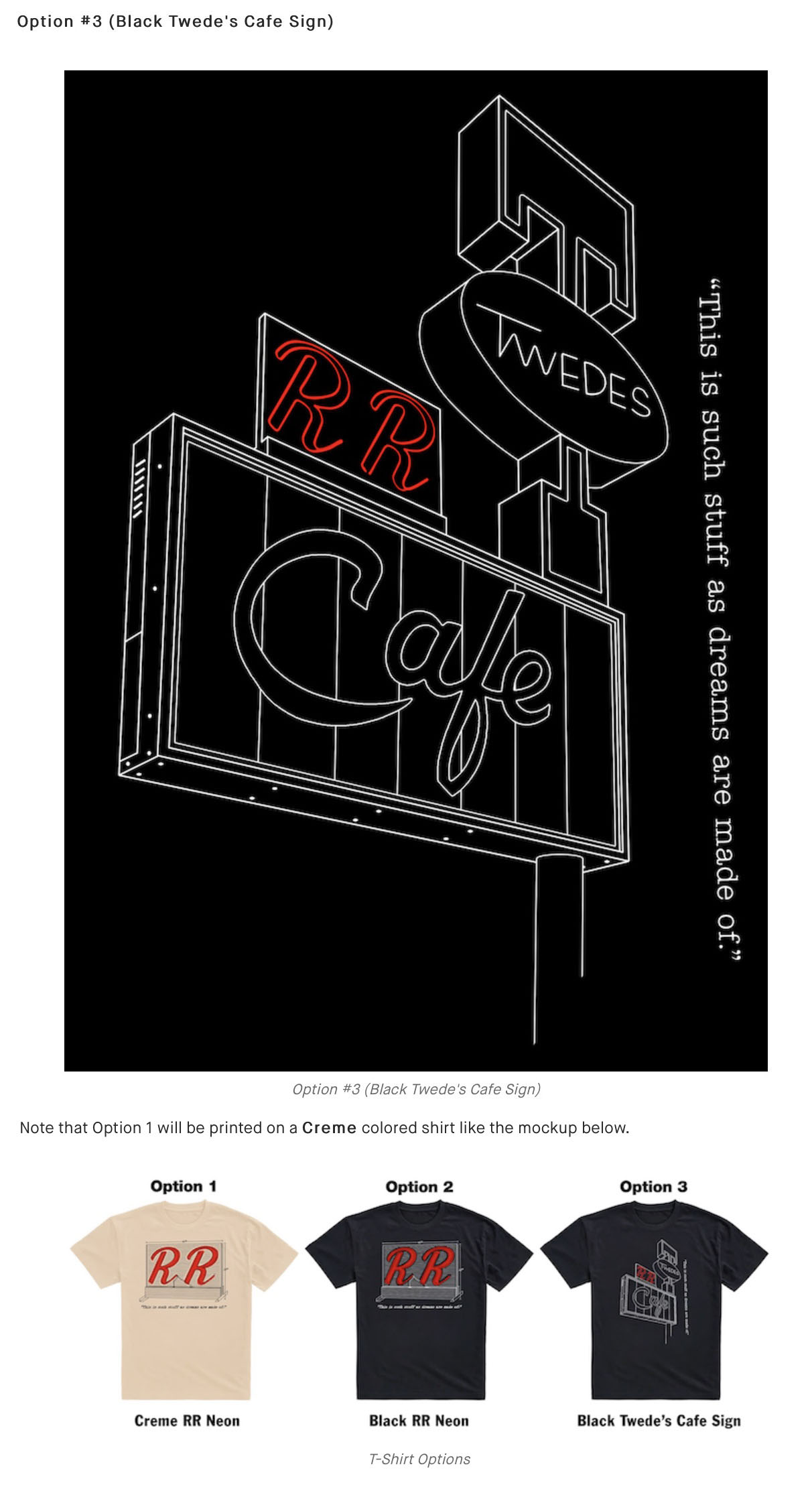 Drawing of red RR neon sign with quote "This is such stuff as dreams are made of." Drawing of red RR neon sign with quote "This is such stuff as dreams are made of." Drawing of red RR neon sign and Twede's Cafe sign with quote "This is such stuff as dreams are made of."