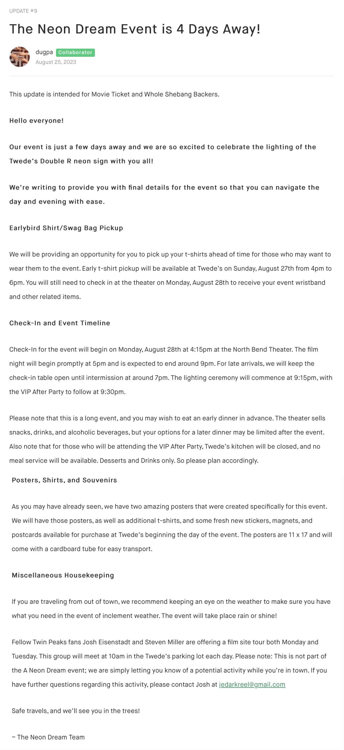 With the campaign being fully funded in two days, the Neon Dream team and Rachel and Max added some stretch goals. These new goals would help expand the in-person event and make it “an even better experience for those making the trek to North Bend.” The goals were also made to benefit those unable to attend to attend.