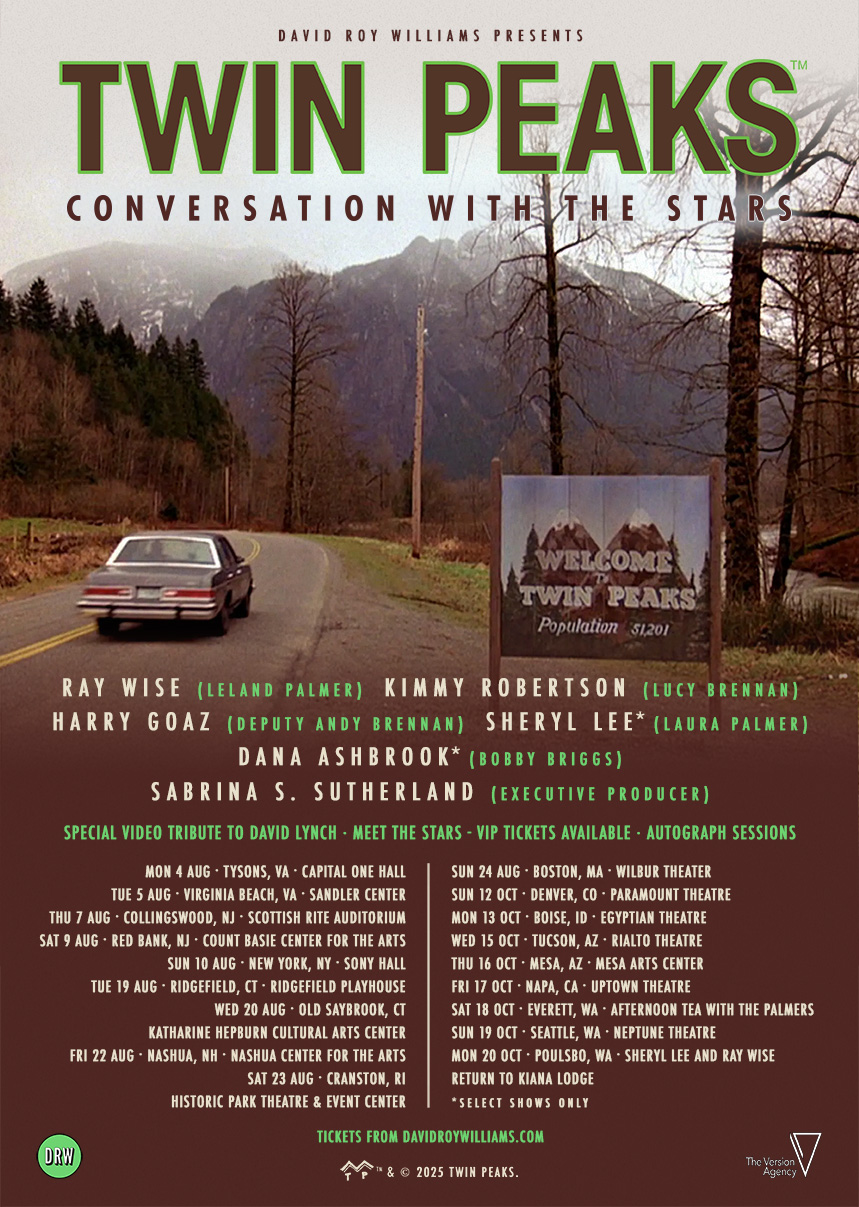 Stars of Twin Peaks, Ray Wise, Harry Goaz, Kimmy Robertson, Dana Ashbrook* Sheryl Lee**, and the Executive Producer of Twin Peaks: The Return, Sabrina S. Sutherland, will tour in 2025 for an exclusive and unique evening of CONVERSATION WITH THE STARS. Presented under license from Paramount Location-Based Entertainment, these events will be a celebration of this iconic television series, affording fans the opportunity to witness and participate in: