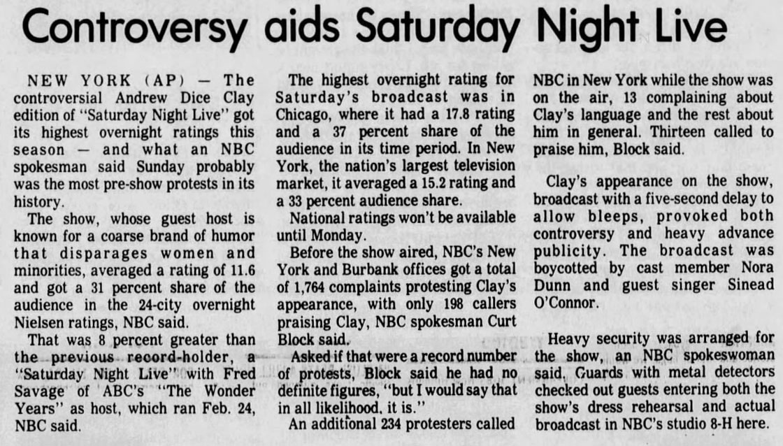 Her intuition paid off as the controversy around Andrew Dice Clay’s hosting drove SNL to the “highest overnight ratings” for season 15.  According to an Associated Press report published in the Enterprise Journal on May 16, 1990, the episode received marks the 24-city overnight Nielsen raitings.