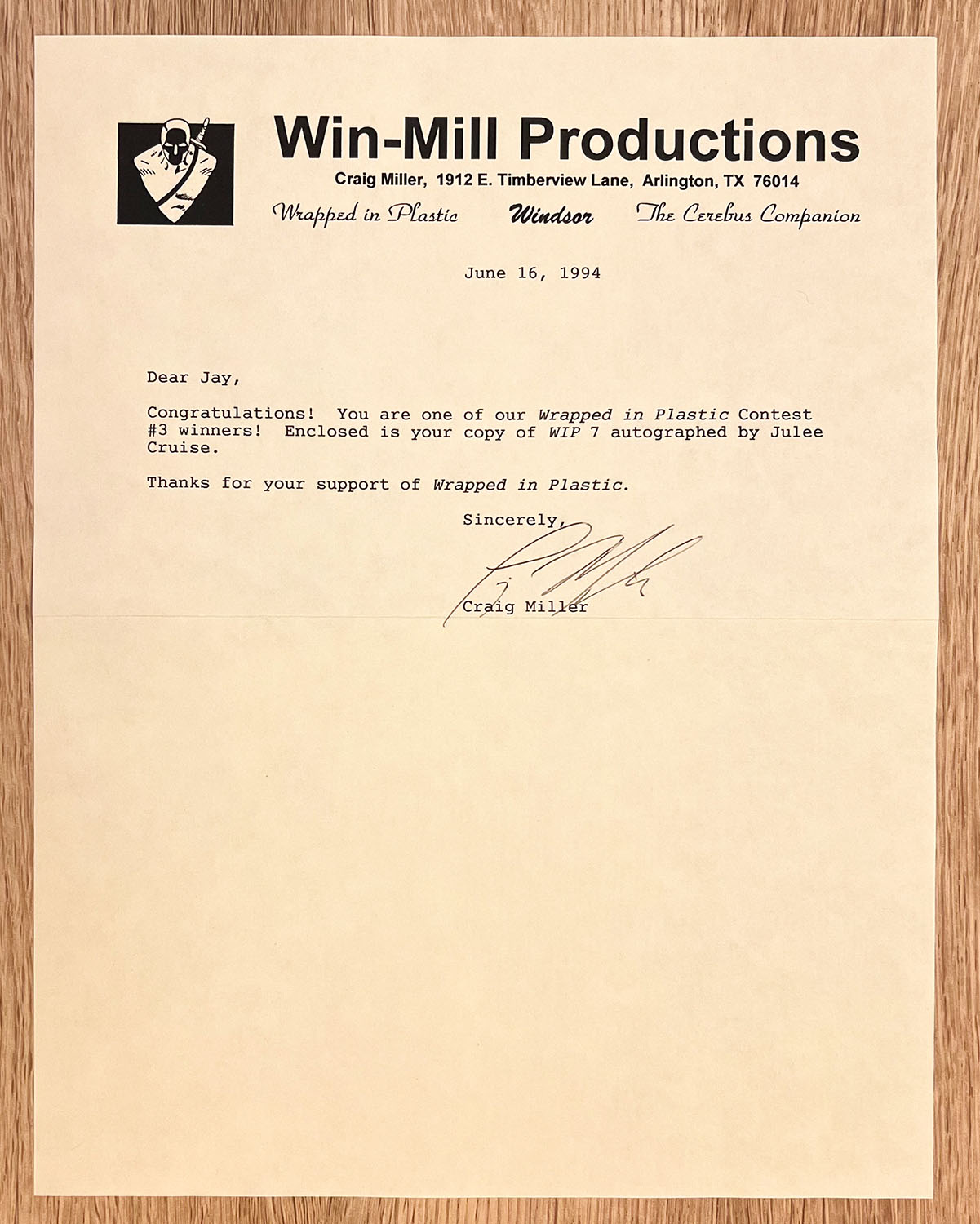 Thirty years later, I stumbled upon one of these signed magazines on eBay. Though I did have the pleasure of meeting Julee Cruise once in 2016, I didn’t have the foresight to bring her issue of Wrapped In Plastic with me, so I jumped at the chance to pick this up. Much to my surprise, a letter from Craig Miller was tucked within the pages.
