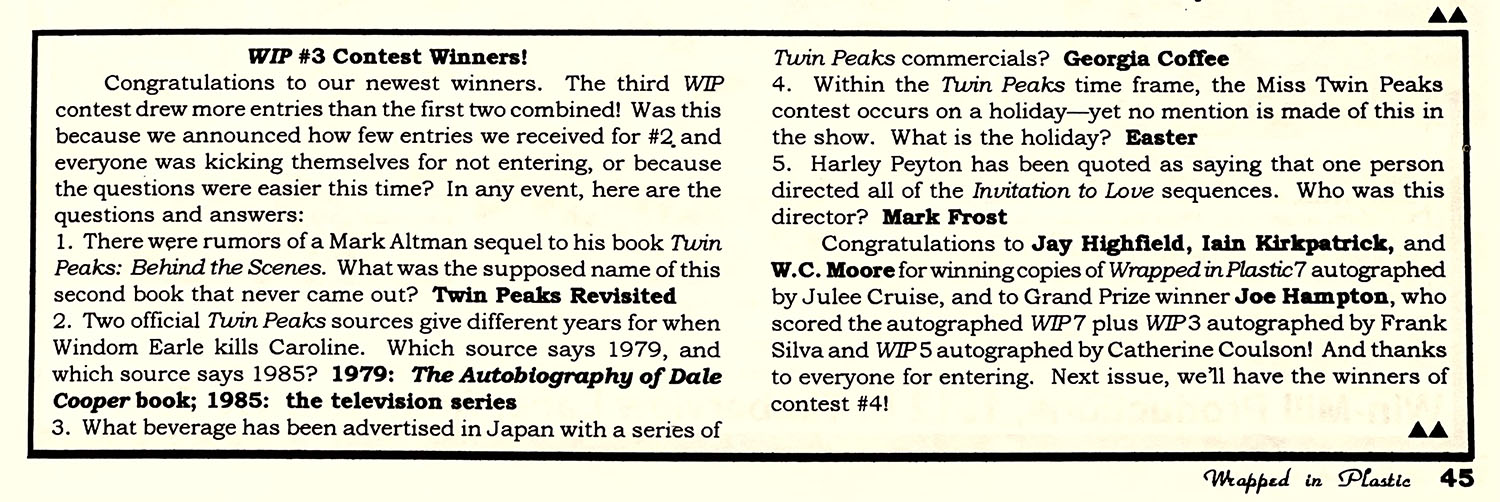 Issue #10 was published in April 1994 and featured the magazine’s third write-in contest. Fans would answer challenging trivia questions for a chance to win copies of issue #7 signed by Julee Cruise, and one grand prize winner would also win issues #3 and #5 signed by Frank Silva and Catherine Coulson respectively. Winners were announced in August 1994 when issue #12 was published.