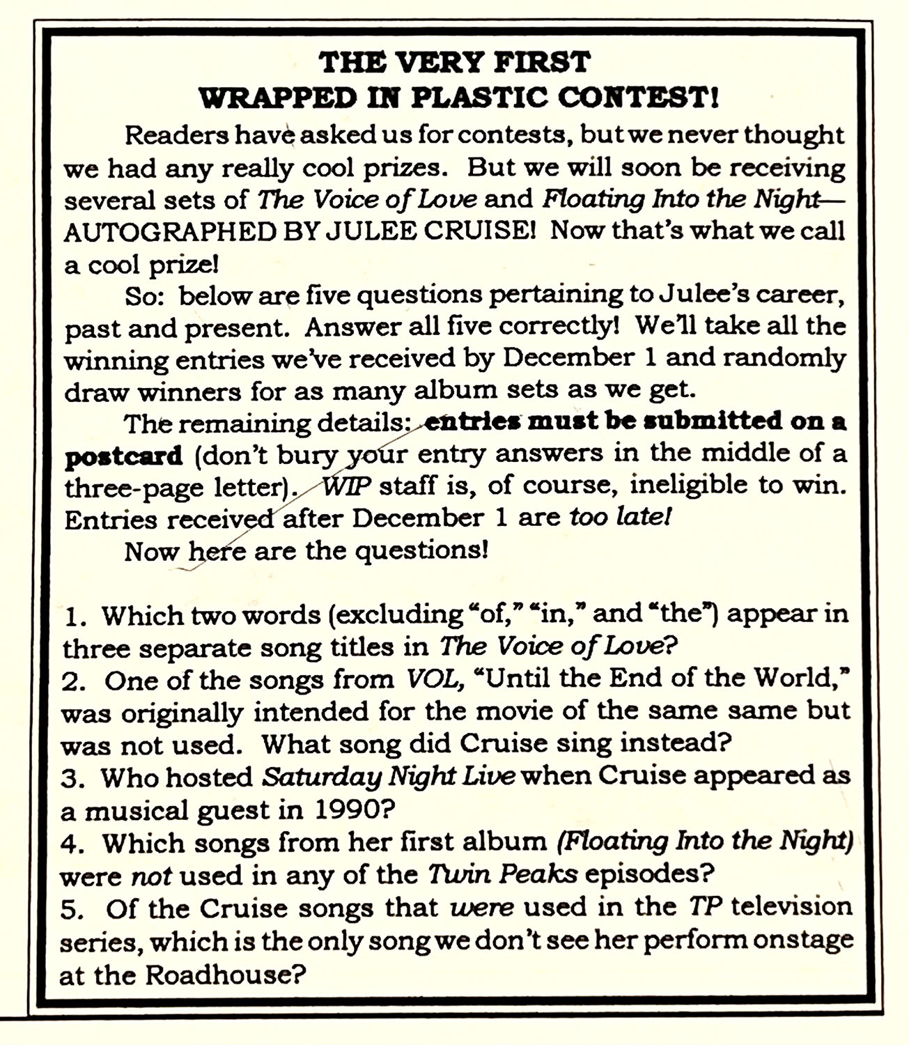 When one sets out to collect Twin Peaks memorabilia, the logical place to start is Wrapped In Plastic magazine. This definitive fan publication dutifully covered Twin Peaks and adjacent media from 1992 to 2005. Throughout their 75 issue run, editors John Thorne and Craig Miller arranged several contests where readers could write in to win back issues of the magazine signed by the stars interviewed within. In 1994, four lucky readers received copies of issue #7 signed by Roadhouse singer Julee Cruise.