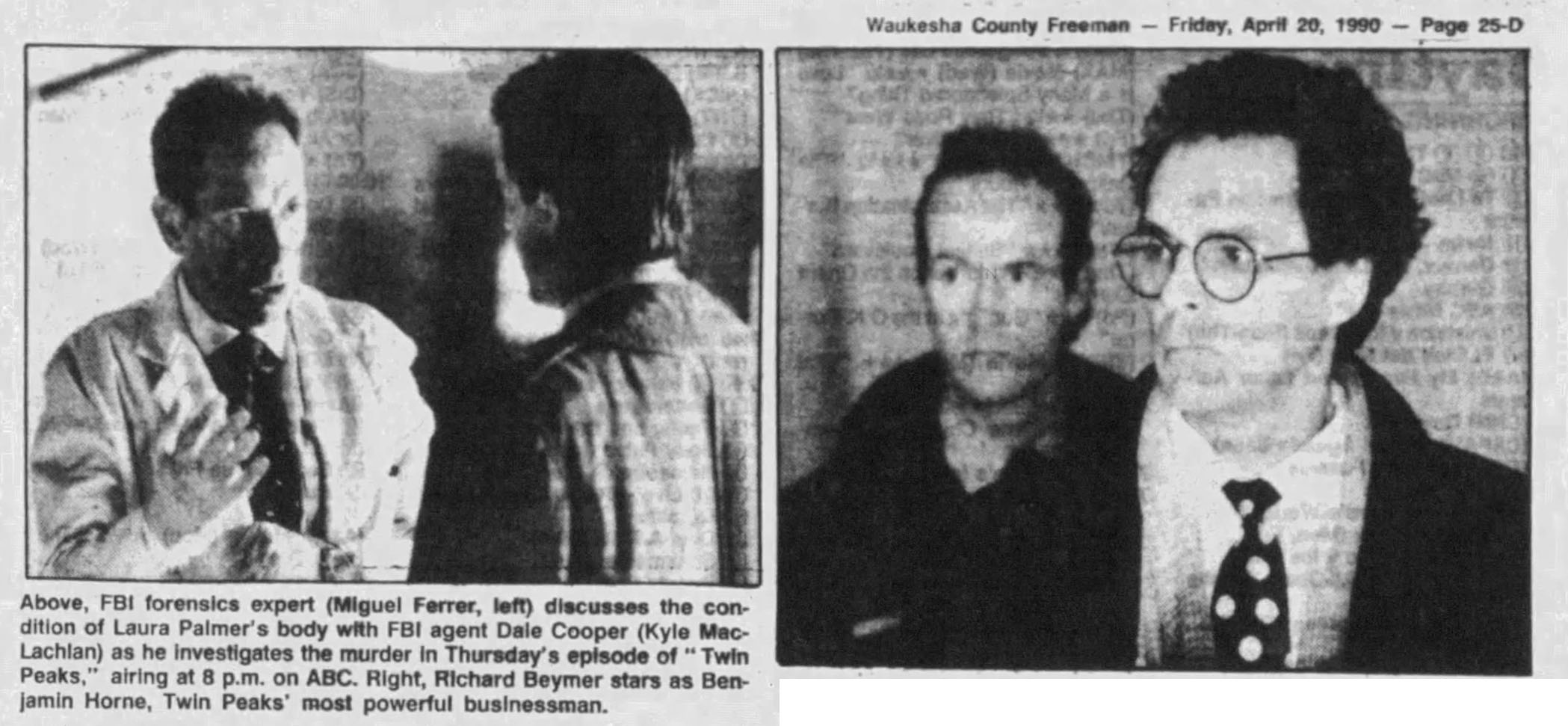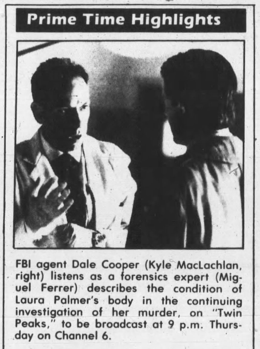 The image was also used to accompany articles about Twin Peaks long after the episode first aired. This syndicated article by Jonathan Storm from Knight-Ridder Newspapers appeared in The Times Tribune on Aug. 5, 1990. It was published in advance of ABC Television rebroadcasting the series beginning Aug. 5, 1990 in advance of the second season premiere on Sept. 30, 1990.