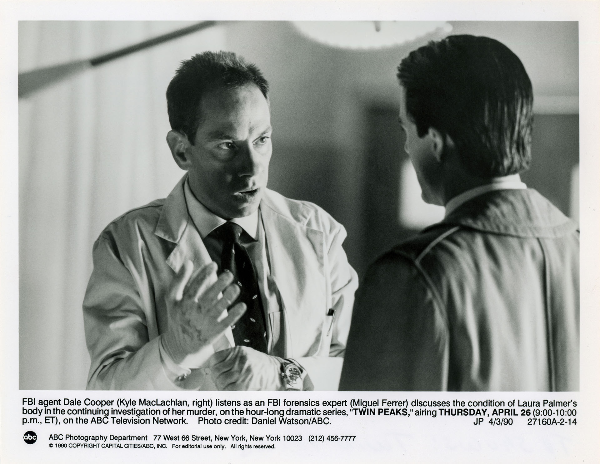 The caption on this image reads: “FBI agent Dale Cooper (Kyle MacLachlan, right) listens as an FBI forensics expert (Miguel Ferrer) discusses the condition of Laura Palmer’s body in the continuing investigation of her murder, on the hour-long dramatic series, “TWIN PEAKS,” airing THURSDAY, APRIL 26 (9:00-10:00 p.m., ET), on the ABC Television Network.”