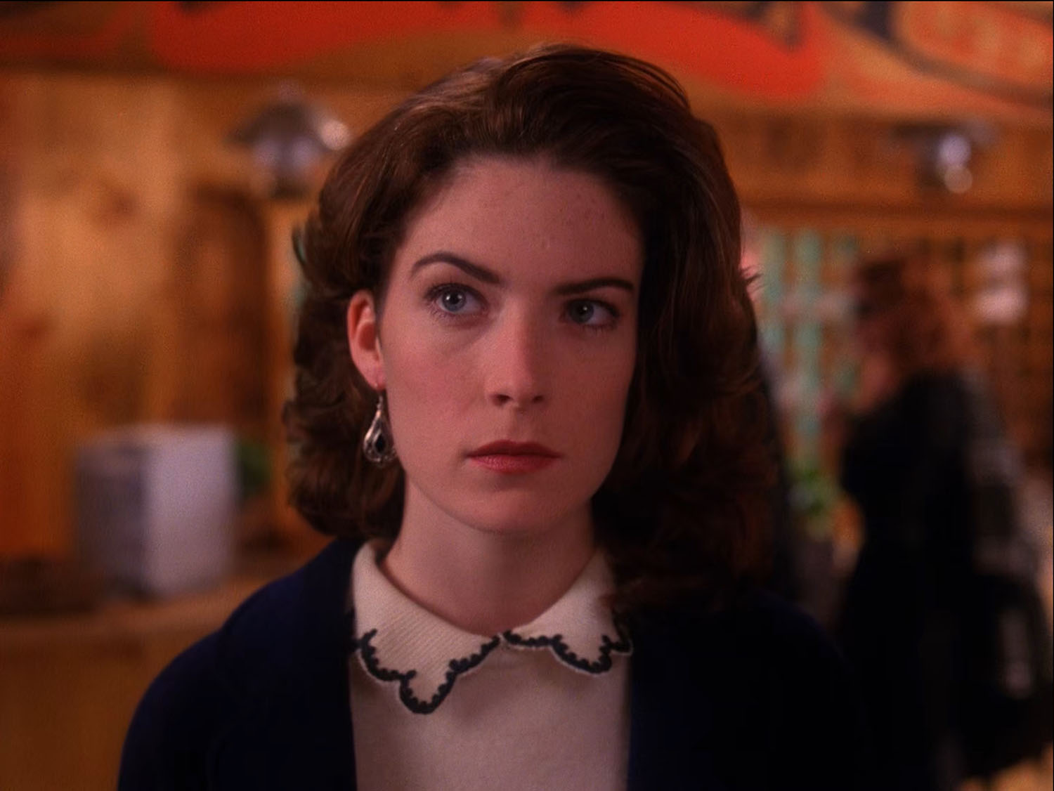 When the camera cuts back, her hair is styled differently and she is missing the dangling earring. No explanation is given as to why things changed. But the earring returns when she speaks with Audrey Horne at the front desk. Now you too will always notice the case of the disappearing earring.