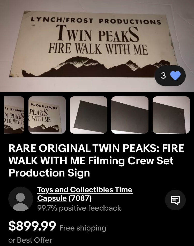 In my years collecting Twin Peaks memorabilia, I have only ever seen one of these in an eBay listing from September 2024. While still rare, the placards from the TV series pop up on auction sites a bit more frequently with a price tag that’s slightly less shocking.