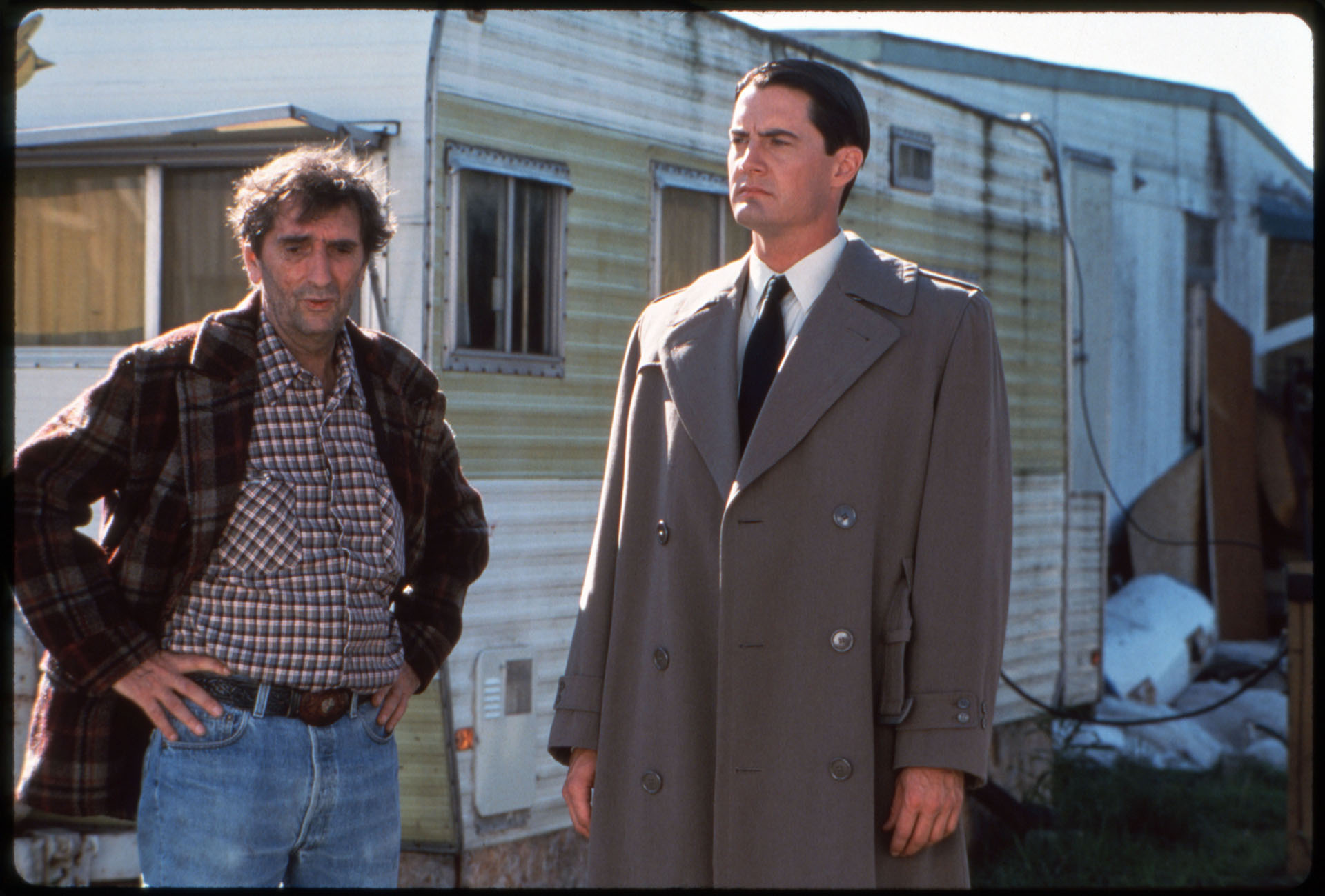 I’ve professed my love of the first 35 minutes of David Lynch’s Twin Peaks: Fire Walk With Me on numerous occasions. I’m particularly drawn to the original Fat Trout Trailer Park, which were the first scenes shot on Sept. 4-5, 1991 in Snoqualmie, Washington. The former Riverside Mobile Home Park is long gone but, like a magician, I long to see every detail I can find from this mysterious place. This article examines an iconic publicity slide image taken by Lorey Sebastian of Carl Rodd (Harry Dean Stanton) and Special Agent Dale Cooper (Kyle MacLachlan) discussing trailers.