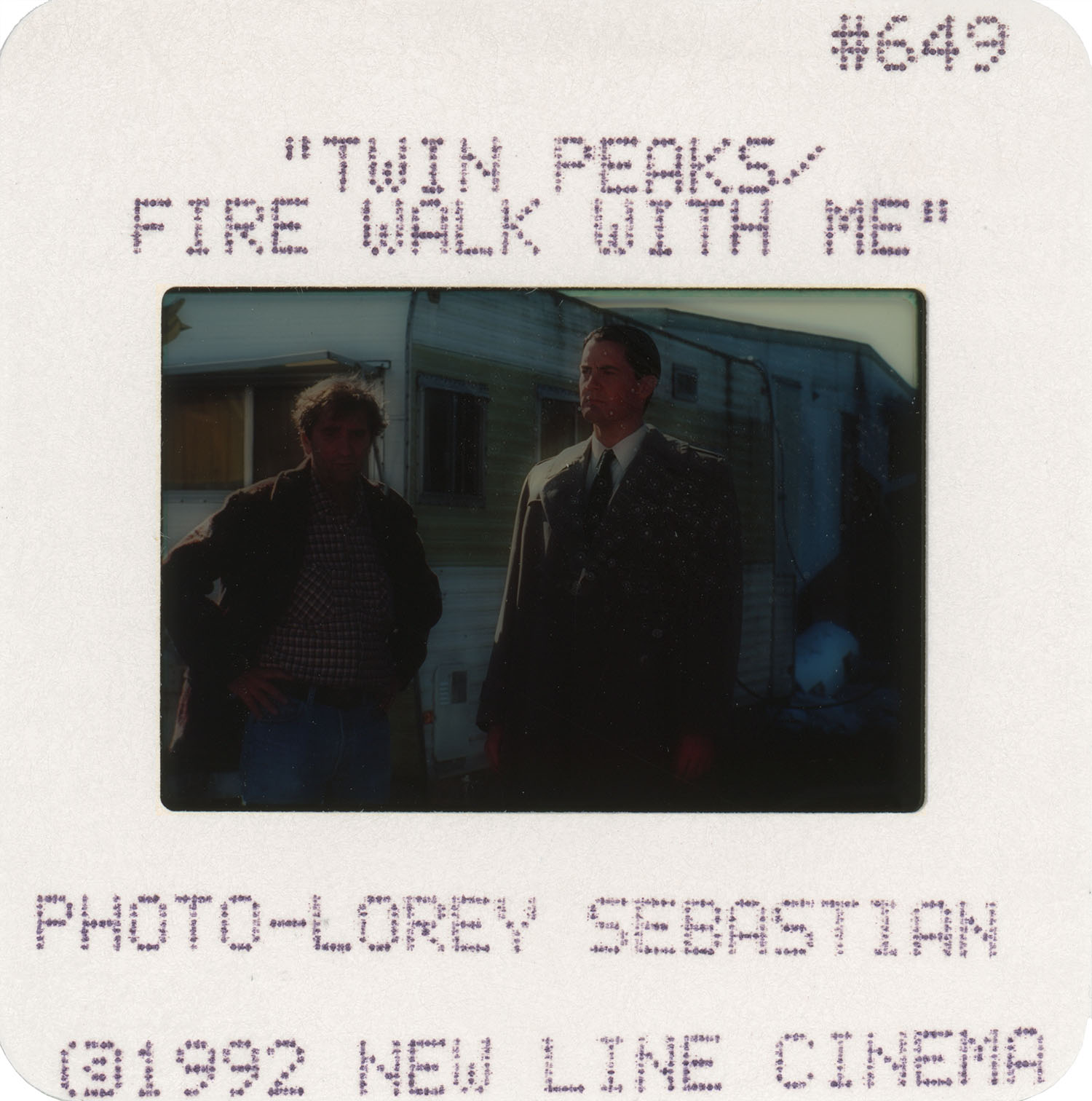 I acquired an assortment of photo slides from an eBay auction which contained slide #649 – a photo of Carl Rodd (Harry Dean Stanton) and Special Agent Dale Cooper (Kyle MacLachlan) discussing trailers at the Fat Trout Trailer Park. The slide has credits to “Twin Peaks / Fire Walk With Me” and “Photo-Lorey Sebastian” and contains the copyright “1992 New Line Cinema.”