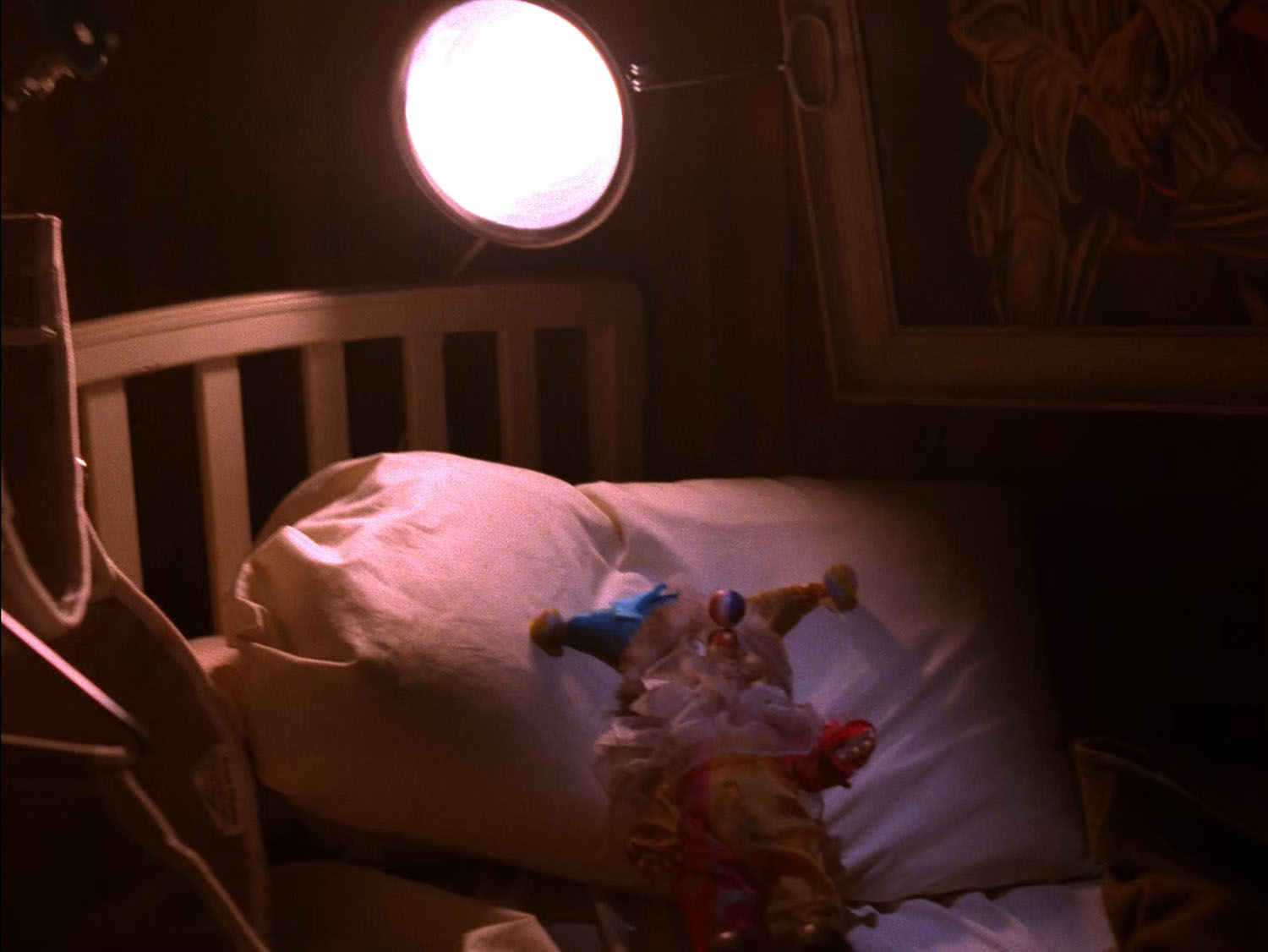The final appearance is in episode 2.013 (#20 of season two) when Shelly is searching for Leo amid power fluctuations in her home. She peers into Leo’s make-shift bed to find a Musical Walking Clown doll (first identified by my fellow Twin Peaks Blog author Vinnie Guidera).