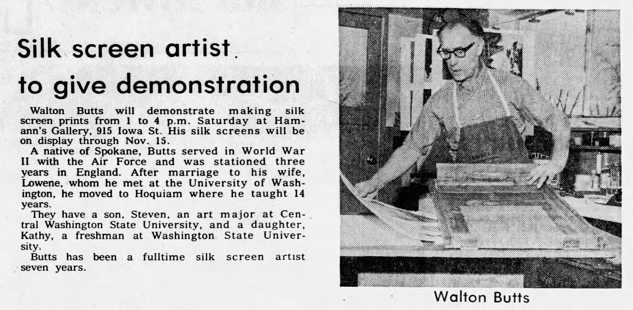 After the war, he married Lowene Stone around 1950 when they were enrolled at the University of Washington. Butts majored in fine art and art education. In 1956, he became interested in the silk screen process and studied with his contemporary Elton Bennett. Walton would spend years as an art teacher with the Hoquiam school district. By 1967, he became a full time silk screen artist creating a number of prints and was exhibited in Seattle Art Museum and other Northwest artist shows.