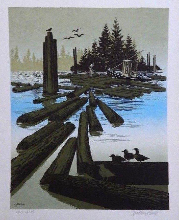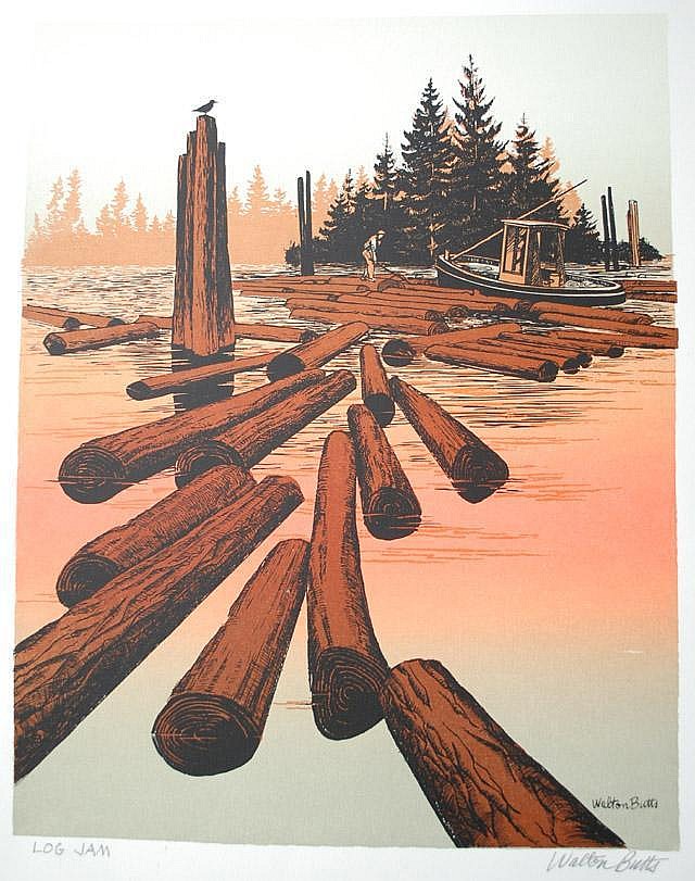 Hoquiam, Washington artist Walton Butts created the image titled, “Log Jam.” While researching this article, I found three different versions of this image. The one above appears to match watch is displayed in the Sheriff’s office. It was part of an auction of seven silkscreen prints from Butts sold in August 2011.
