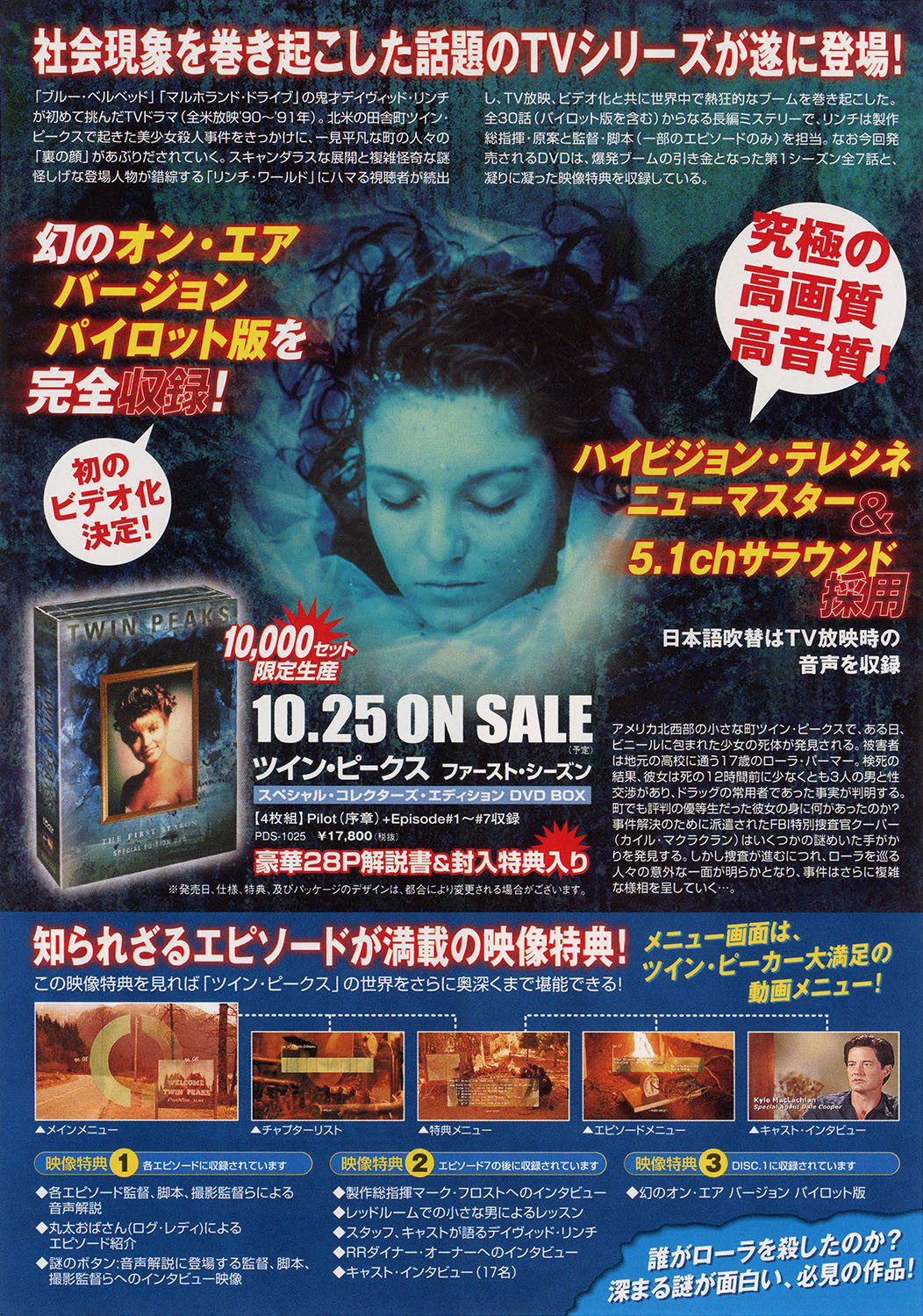This bookmark flyer advertised the Japanese release of Twin Peaks – The First Season on DVD on Friday, October 25, 2001. The iconic image of Laura Palmer found wrapped in plastic was included on the front. It would be the same image used on the physical packaging both in North America and Japan.