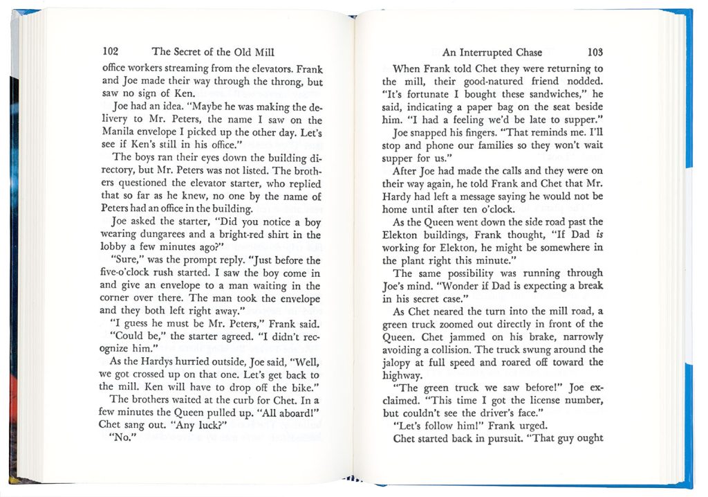 This Hardy Boys book seems to be one of several Sonny Jim was reading. It’s difficult to tell what other books are in his collection but you can see a stack of blue spines stacked on the nightstand.