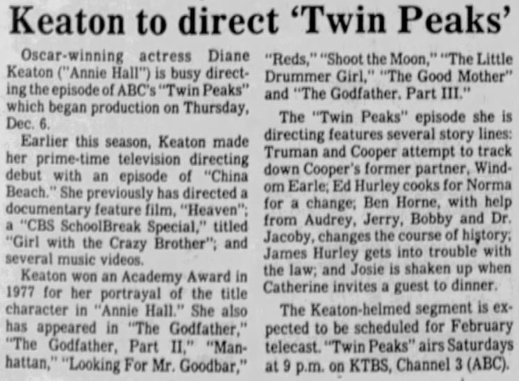 News about Diane Keaton directing an episode of Twin Peaks first appeared in newspapers on Dec. 12, 1990. The Shreveport Journal stated her episode – #2.015 – began production on Thursday, Dec. 6.