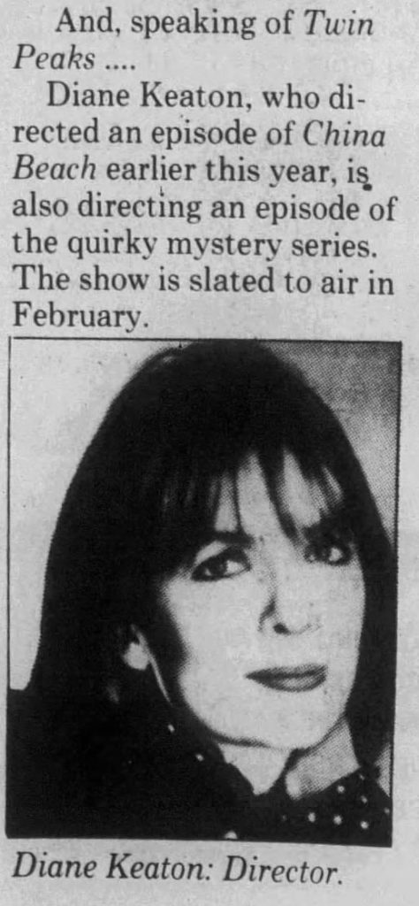 A few weeks after ABC Television put Twin Peaks on hiatus after airing episode 2.016 (#23), Lynch and Frost spoke with reporters to offer a rally cry to fans. During this meeting, David spoke highly of Diane Keaton’s episode as reported in The Berkshire Eagle on Feb. 28, 1991.