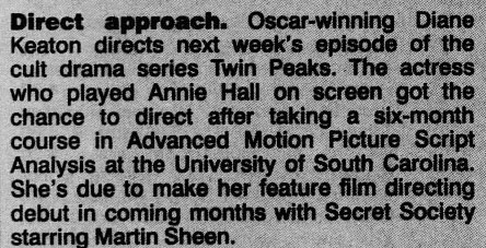 According to The Northern Echo Yorkshire edition from April 10, 1991, Keaton got the chance to direct Twin Peaks “after taking a six-month course in Advanced Motion Picture Script Analysis at the University of South Carolina [sic].” Yet I’m thinking the British paper meant to say “University of Southern California,” not “South Carolina” as it appears no such course existed then at the South Carolina university.
