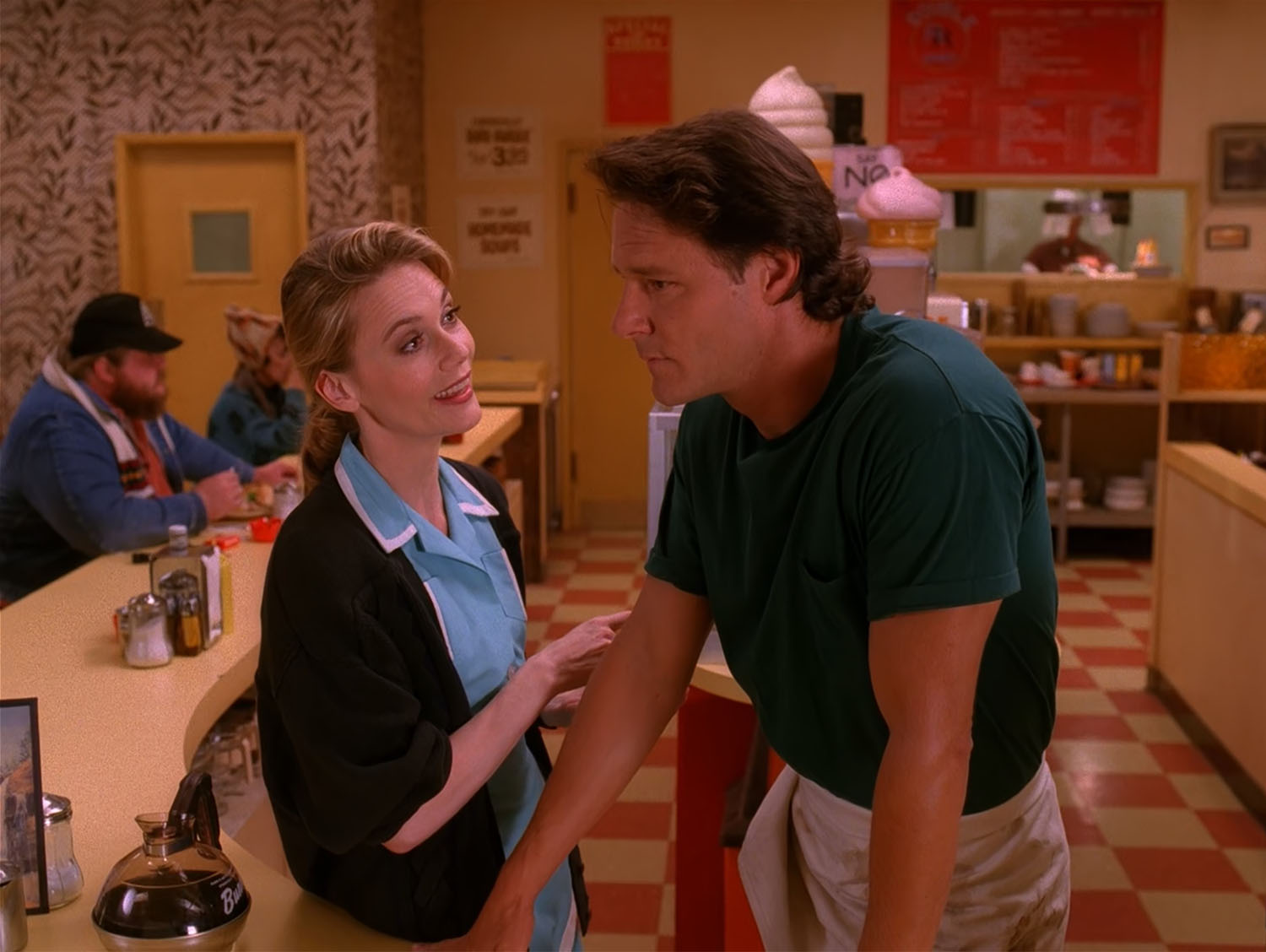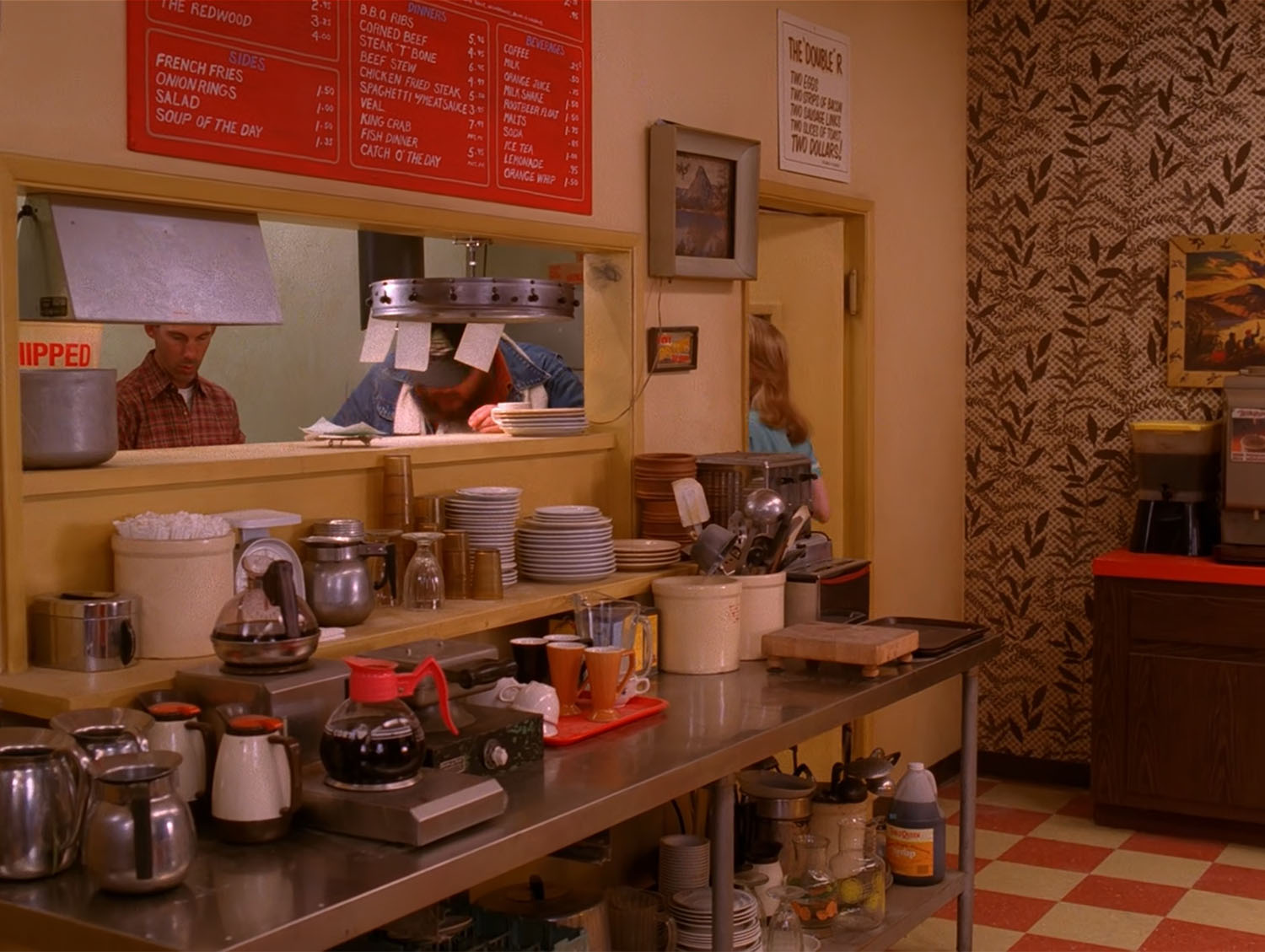 After being removed from the dining area, he is seen sampling food in the Double R kitchen.