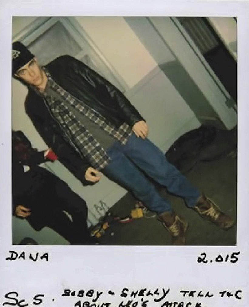Flash forward to the Diane Keaton-directed episode 2.015 (#22) and Bobby Briggs is seen sporting the black cap while being questioned by Sheriff Harry Truman and Deputy Dale Cooper. This continuity Polaroid from The Mauve Zone shows Dana Ashbrook behind the scenes.