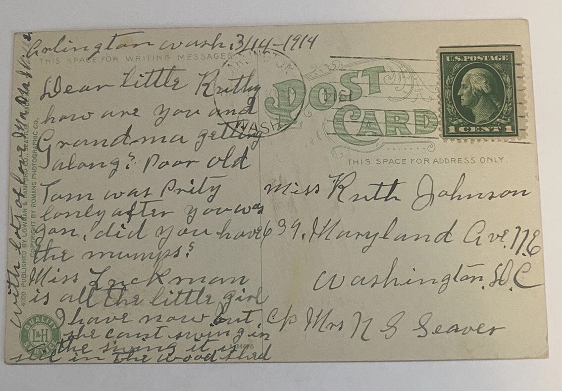 The card may date from sometime after 1914-1915 as I found the image above with the same “See Washington First” image on front. The back, however, was different than the card back shown earlier in this article.