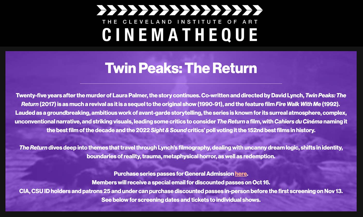 The Cleveland Institute of Art Cinematheque will continue screening Twin Peaks: The Return in December. This event holds a special place in Twin Peaks history as the Cleveland Cinematheque screened the pilot episode on Jan. 7, 1990, months before it aired on the ABC Television Network. The screenings will be held at 11610 Euclid Avenue in Cleveland, Ohio.
