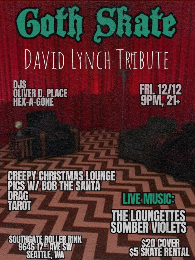 The Southgate Roller Rink, located at 9646 17th Avenue SW in Seattle, Washington, is holding a David Lynch-inspired night of surreal magic for their Goth Skate. The event has an admission of $20 and $5 skate rental.
