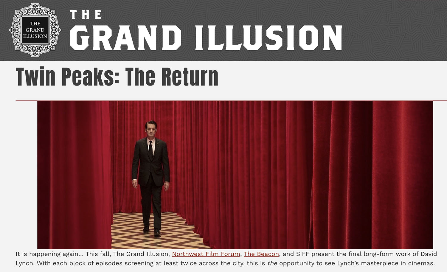 The Grand Illusion Cinema and Northwest Film Forum are continuing their screenings of Twin Peaks: The Return between Tuesday, December 2 to Tuesday, December 16. Screenings are being held at 1515 12th Avenue in Seattle.