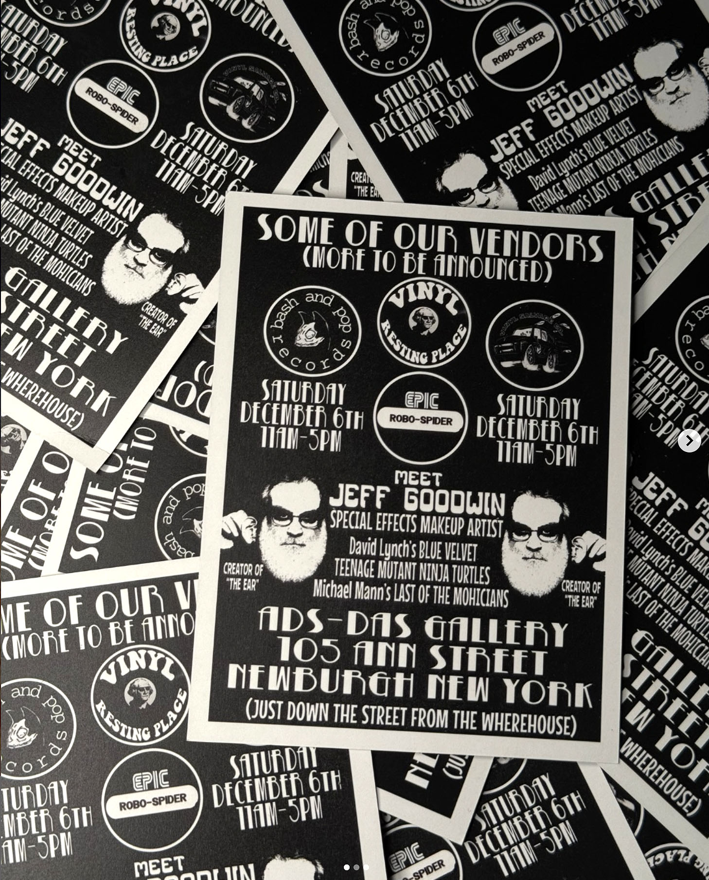The Wherehouse is taking over the ADS-DAS Gallery, located at 105 Ann Street in Newburgh, New York, on Saturday, December 6 from 11:00 a.m. to 5:00 p.m for the Vinyl Resting Place Holiday Pop-Up Record show. They are planning a full day of rate digging, rare finds, collectors’ gems, and some truly killer vendors. Additionally Jeff Goodwin will be present. He’s the special effects artist behind the iconic “ear” from David Lynch’s Blue Velvet.