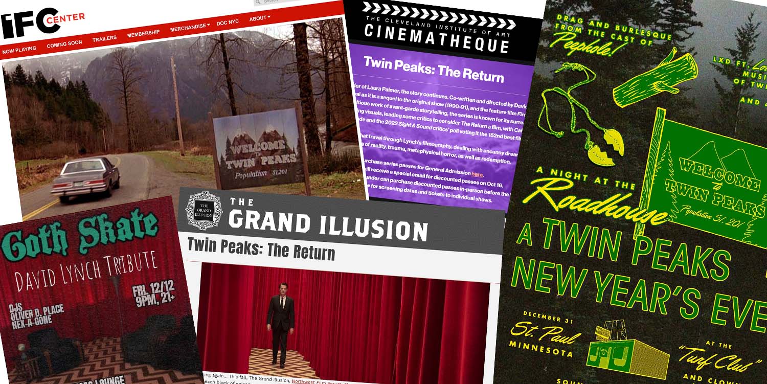 Since launching Twin Peaks Blog nearly eight years ago, I’ve enjoyed the “whole damn town” of folks who love David Lynch and Mark Frost’s Twin Peaks and the actors, musicians and crew who worked on this wonderful and strange show. Since Lynch’s passing in early January 2025, I’ve noticed a spike in themed events inspired by his works. With that said, I’m going to attempt a new monthly article that highlights activities and events taking place around the world. If you’d like to write about your experience or share images, please reach out (contact information below). Here is a look at upcoming Twin Peaks and David Lynch-themed events happening in December 2025.
