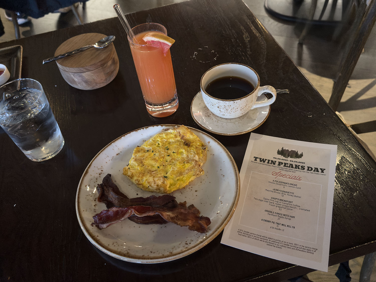 Since the event didn’t start until 10:00 a.m., I had time to grab another item off the Twin Peaks Day menu at The Salish Lodge & Spa. This time, I chose Coop’s Breakfast which was damn fine cup of Campfire Coffee, two eggs over hard, super-crispy bacon … cremated and freshly squeezed grapefruit juice.