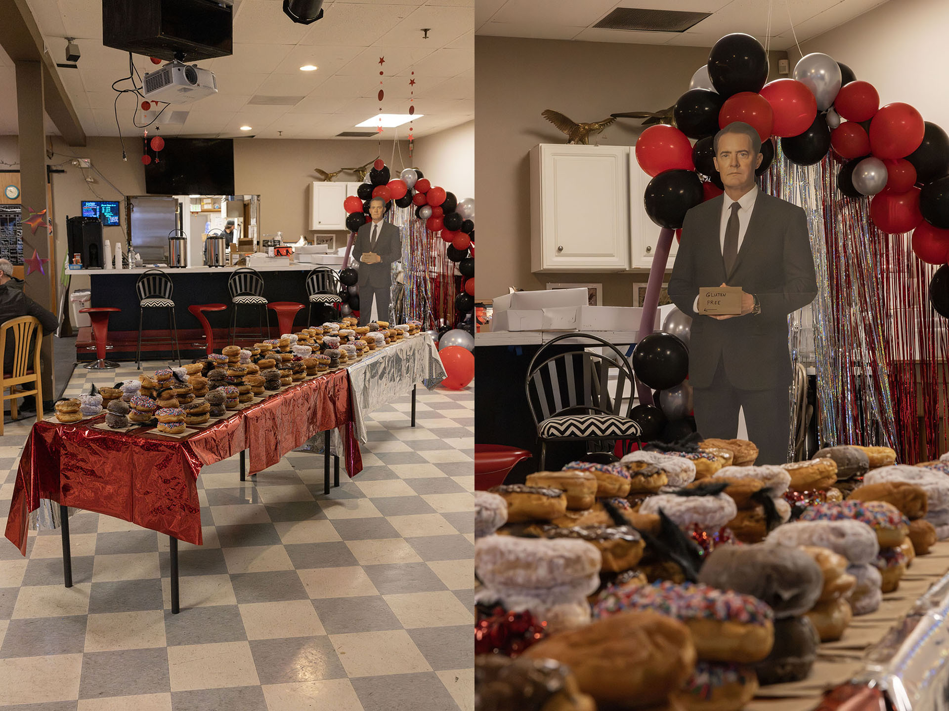 Upon entering Snoqualmie Valley Eagles, I was greeted with two tables with doughnuts stacked three-high. In the distance, a standee of Special Agent Dale Cooper kept watch over this “policeman’s dream.”