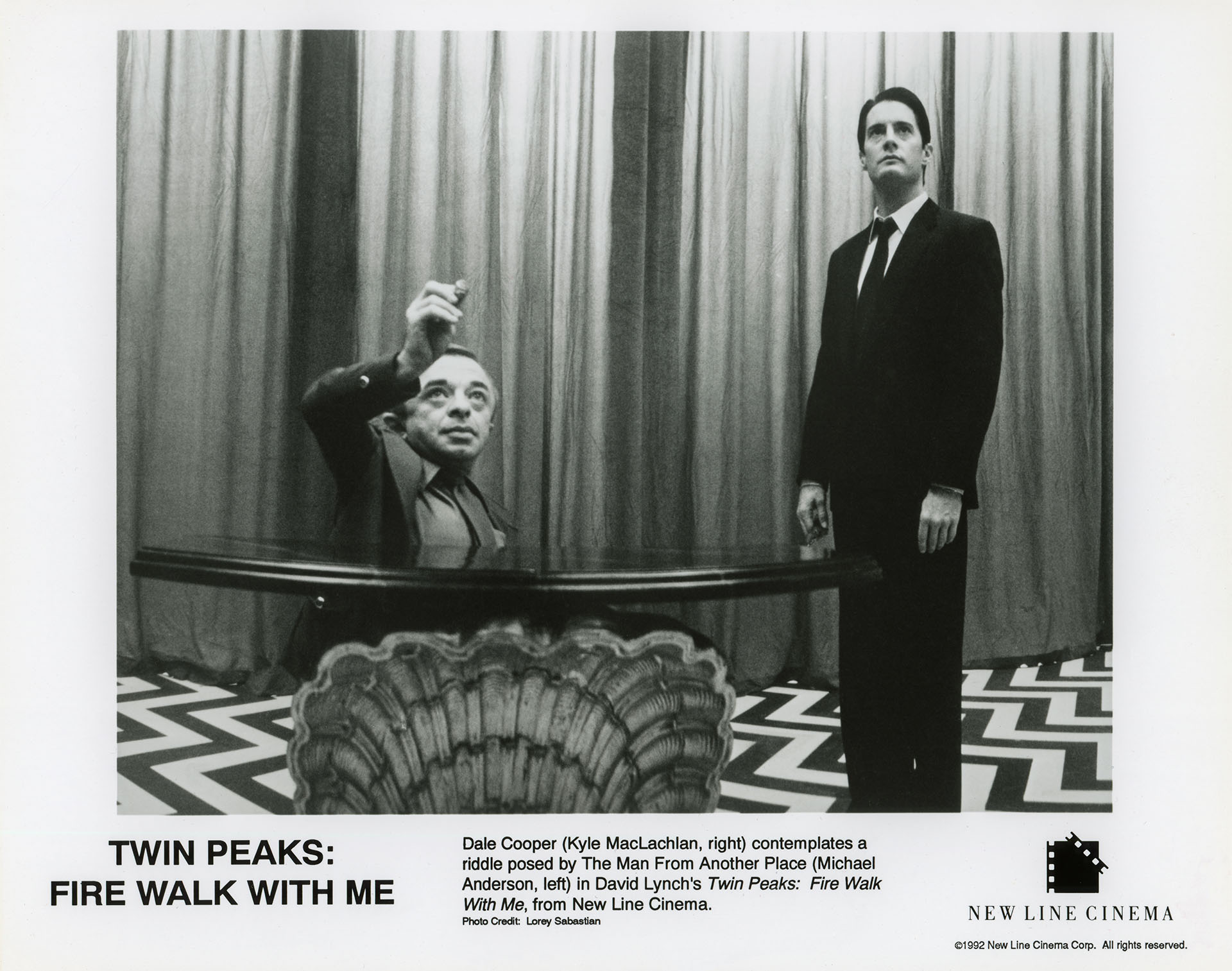 After more than three decades of being a Twin Peaks fan, I love spotting little details I’ve never noticed. I’ve looked at this publicity photo from Twin Peaks: Fire Walk With Me of the Little Man From Another Place (Michael J. Anderson) and Special Agent Dale Cooper (Kyle MacLachlan) in the Red Room for decades. It was only when I was writing this article that I noticed something in Cooper’s hand.