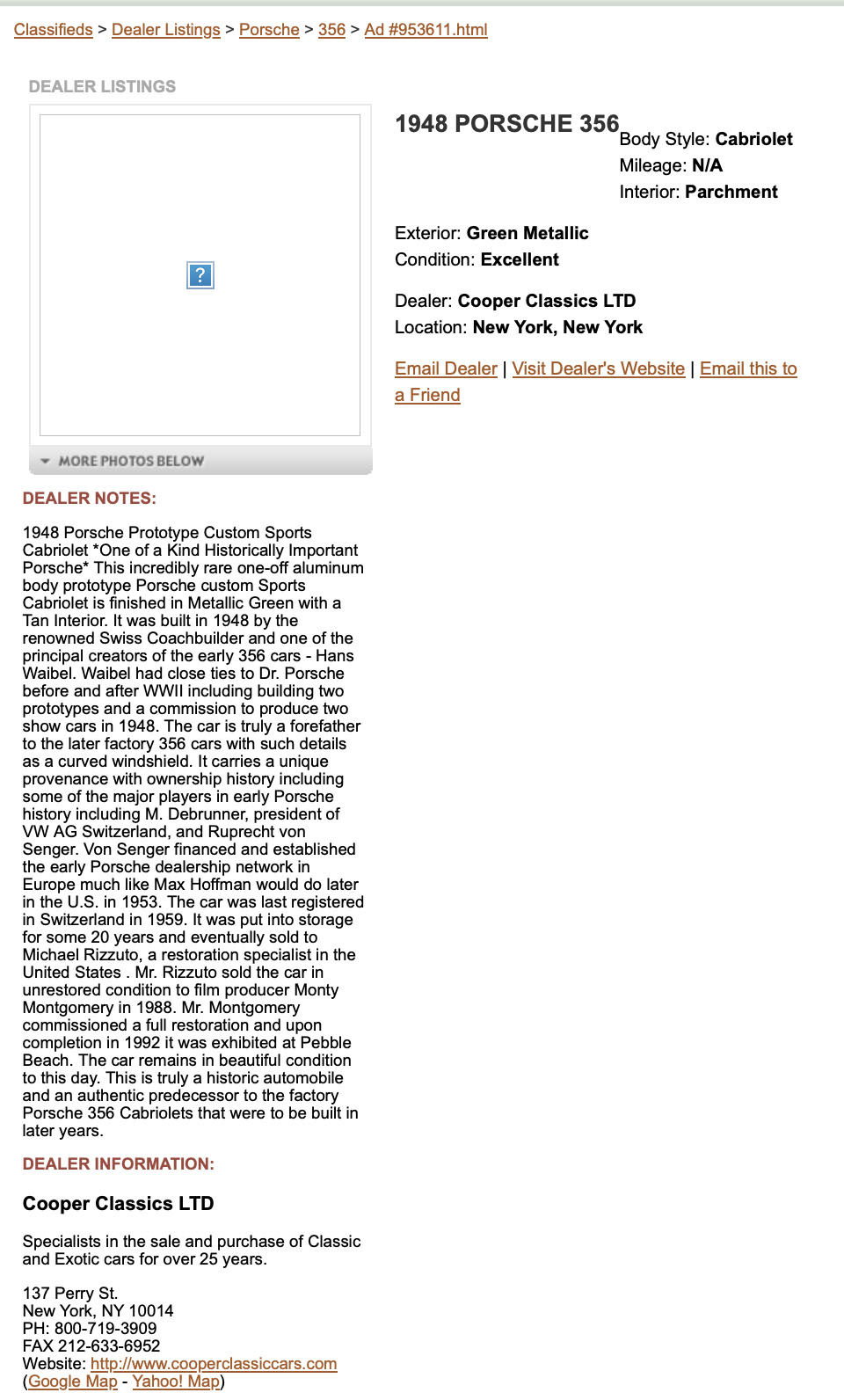 On March 21, 2024, the user Wendax commented on the Autopuzzles forum that it was for sale: “The car is in Argentina right now and up for sale, again falsely labelled, this time as a ‘1948 Waible [sic]/ Porsche 356 Cabriolet’.”