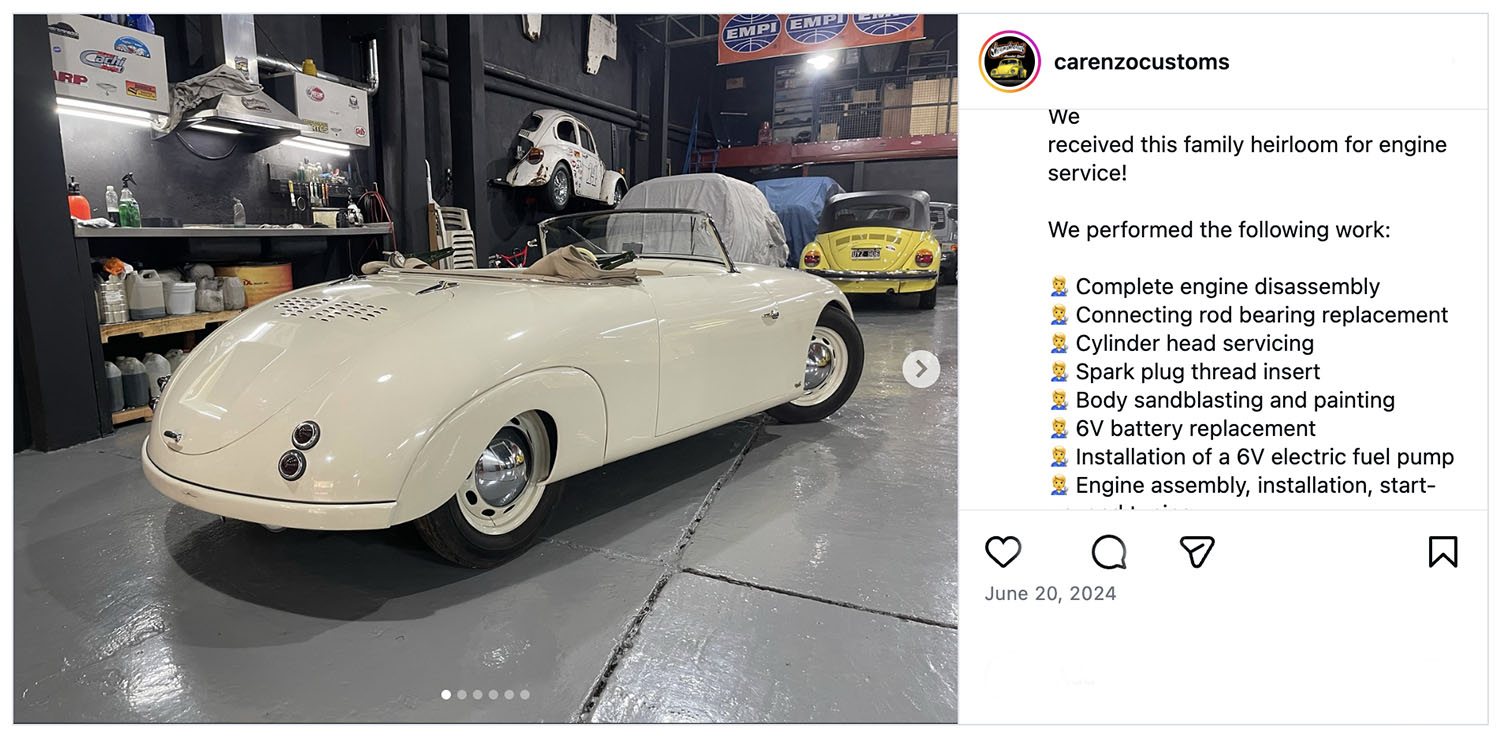 Someone purchased the car around June 2024 as they took it to Carenzo Customs in Buenos Aires for engine service. The shop did the following: complete engine disassembly; connecting rod bearing replacement; cylinder head servicing; spark plug thread insert; body sandblasting and painting; 6V battery replacement; installation of a 6V electric fuel pump, Engine assembly, installation, start-up, and tuning.
