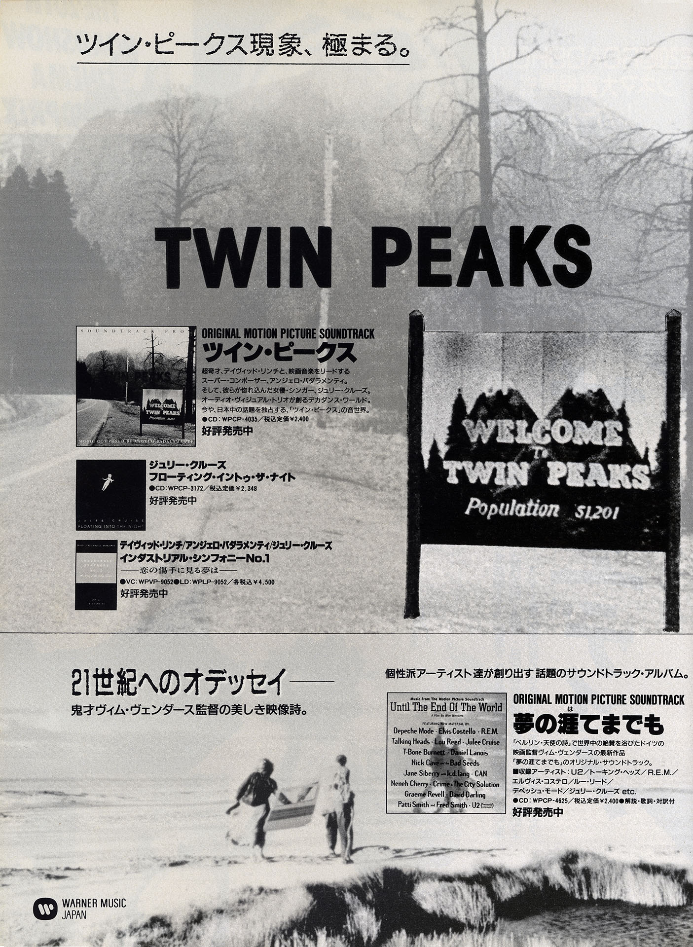 The final Twin Peaks-related item in Roadshow magazine is an advertisement for music including the official television soundtrack, Julee Cruise’s “Floating Into The Night” and “Industrial Symphony No. 1.” The translated headline on the ad read, “The Twin Peaks phenomena reaches its peak.”