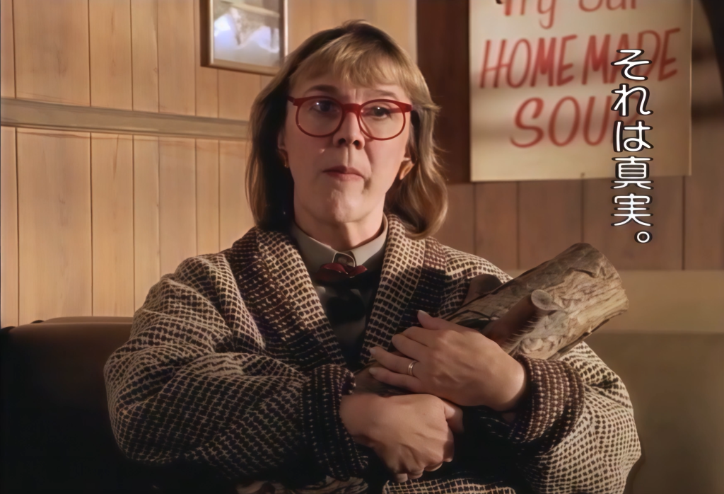 Catherine Coulson: No, they’re not parodies at all. They’re in the style of Twin Peaks, but it’s like a “no play,” you know that kind of Japanese play? It’s very simple. I think that one of the reasons why Twin Peaks appealed to the Japanese mind so much is that there’s a certain kind of clean line about the way the show unfolded, and these commercials are extremely simple and very beautiful. There’s lightning flashing outside the window, and the Log Lady says, “It’s true” a lot. And I understand that people in Japan now say, “It’s true.” It’s an amazing thing as an actor to think that you’ve actually had that kind of impact on people.