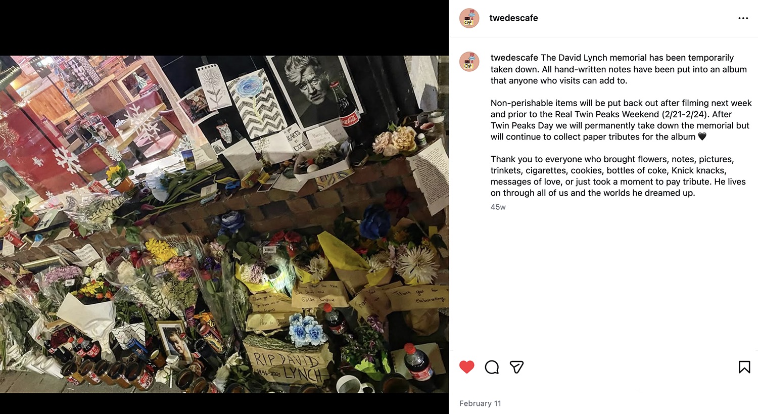 The memorial was back in place by February 20 just prior to the start of The Real Twin Peaks 2025 event. The Pie-N-Cry event seemed like the perfect way for fans to gather and share in their grief after the beloved director’s passing.