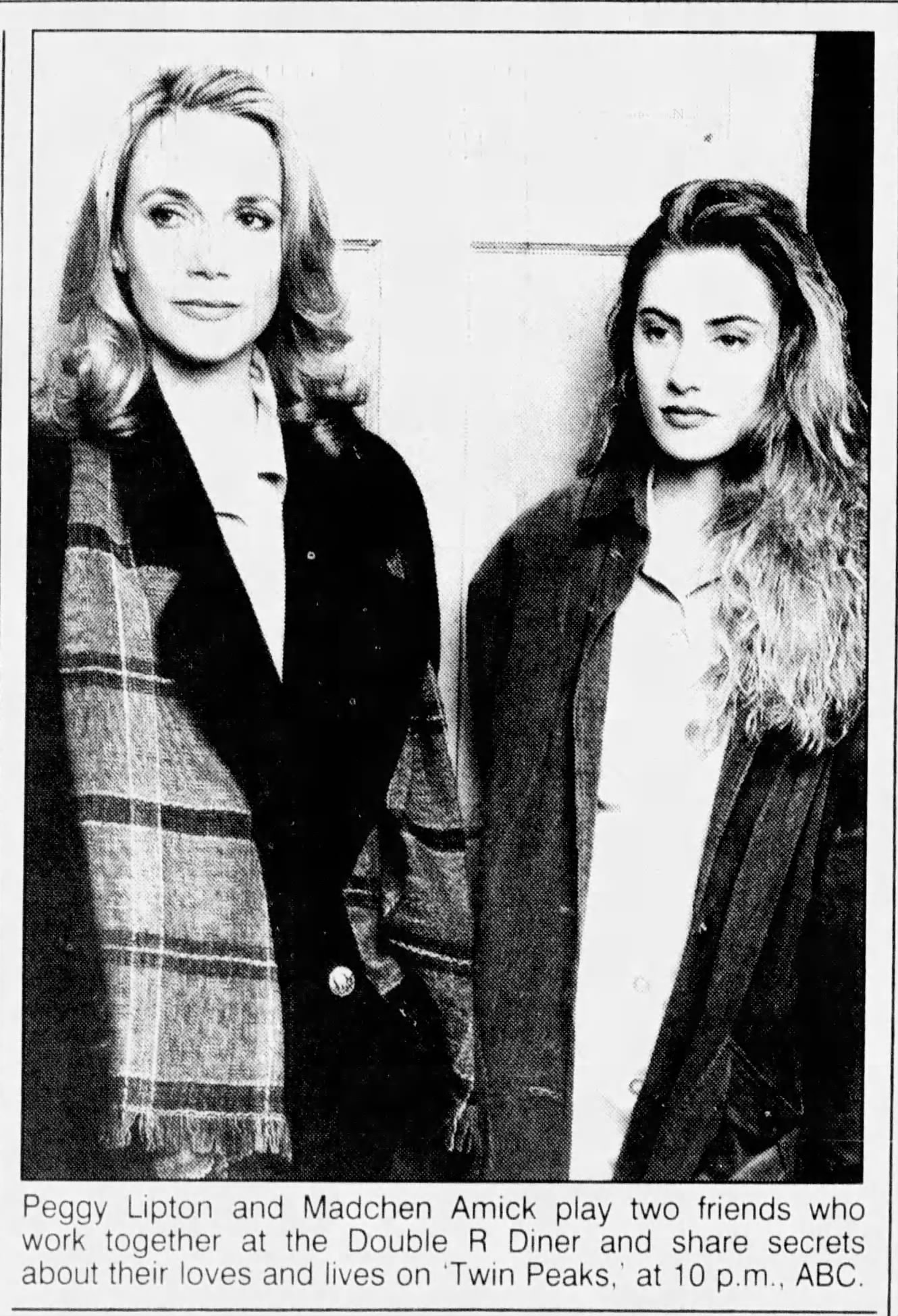 Peggy Lipton and Mädchen Amick, two friends who work together at the Double R Diner, share secrets about their loves and lives on the hour-long dramatic series, “TWIN PEAKS,” which begins with a special two-hour premiere, SUNDAY, APRIL 8 (9:00-11:00 p.m., ET), on the ABC Television Network. The program will premiere in its regular time period, THURSDAY, APRIL 12 (9:00-10:00 p.m., ET). Photo credit: Craig Sjodin/ABC. JP 3/20/90 27223A-7-10