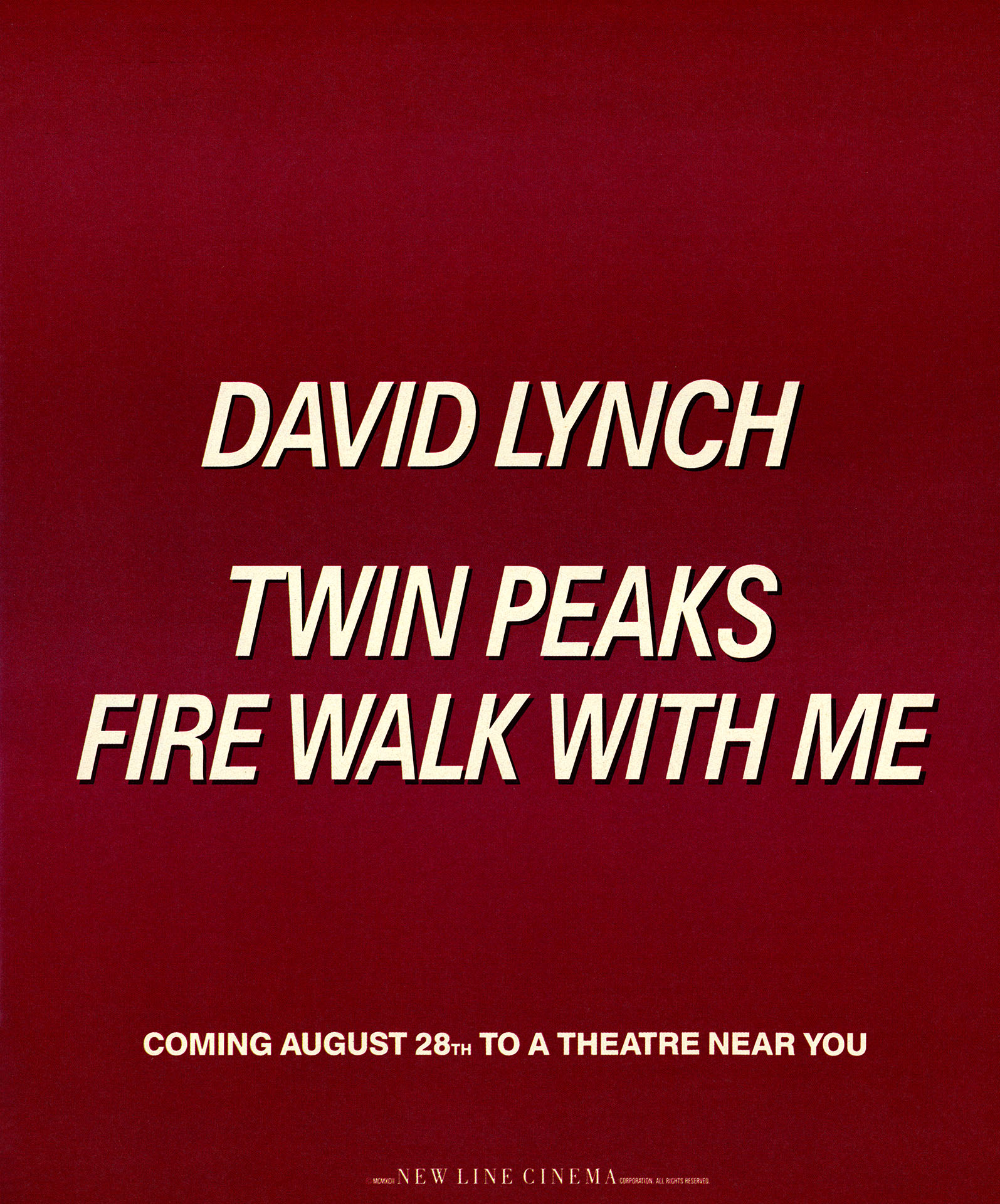 I love David Lynch’s name uses the same font as the film’s logo. The ad states the film would be “Coming August 28th To A Theatre New Year.” The New Line Cinema logo with the year 1992 in Roman numerals – MCMXCII – is printed along the bottom.
