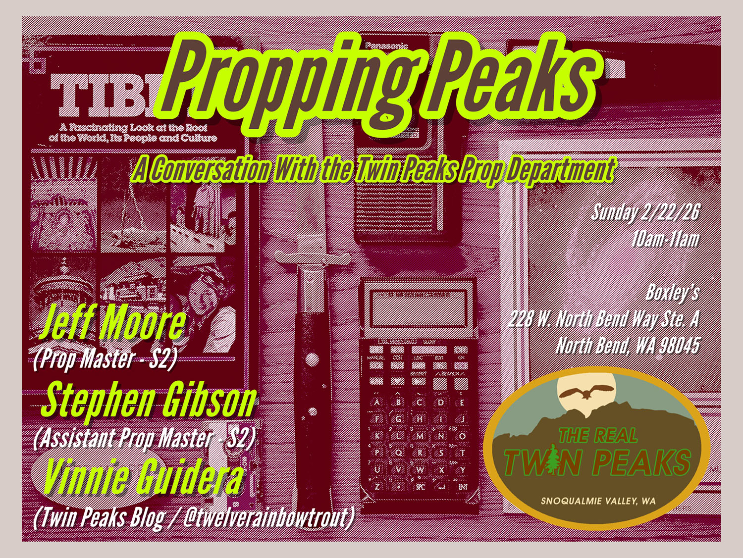 Thanks to both Dave Robinson and Jeff Moore for their help in solving this mystery. If you’re visiting the Snoqualmie Valley for The Real Twin Peaks event this February, be sure to attend the prop panel on February 22, 2026 at 10 a.m. at Boxley’s. I’ll be chatting with Jeff and assistant prop master Stephen Gibson about their work on Twin Peaks, and we just might have this piece on hand!