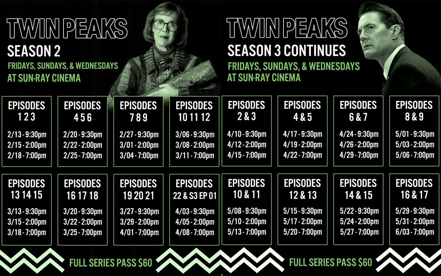 Tampa’s Sunray Cinema, located at 12332 University Mall Ct., is screening the entire series of Twin Peaks from January 23 to June 3, 2026. Episodes will be aired on Fridays, Sundays and Wednesdays. They are offering a full series pass for $60.