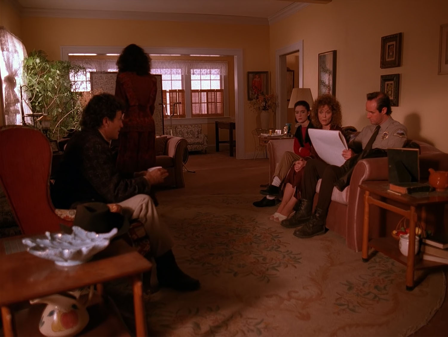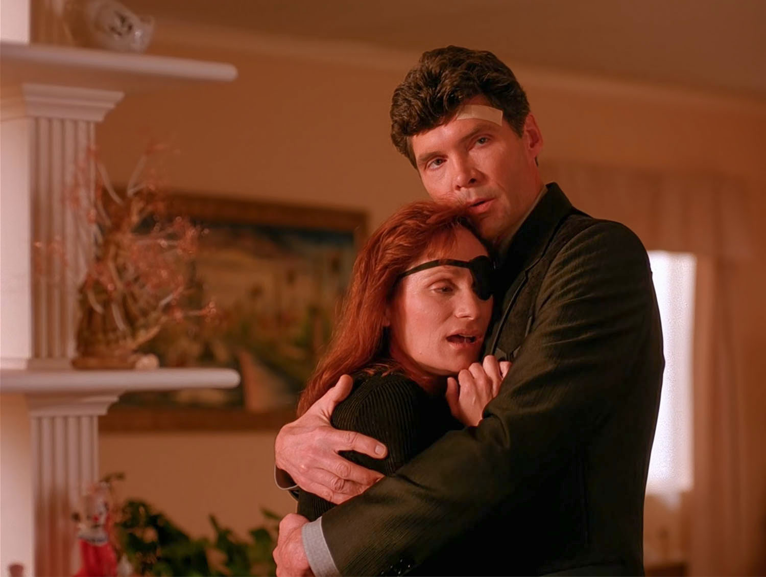She is dressed in the outfit seen in Twin Peaks episode 1.003 when Big Ed Hurley comforts Nadine as James Hurley returns home.
