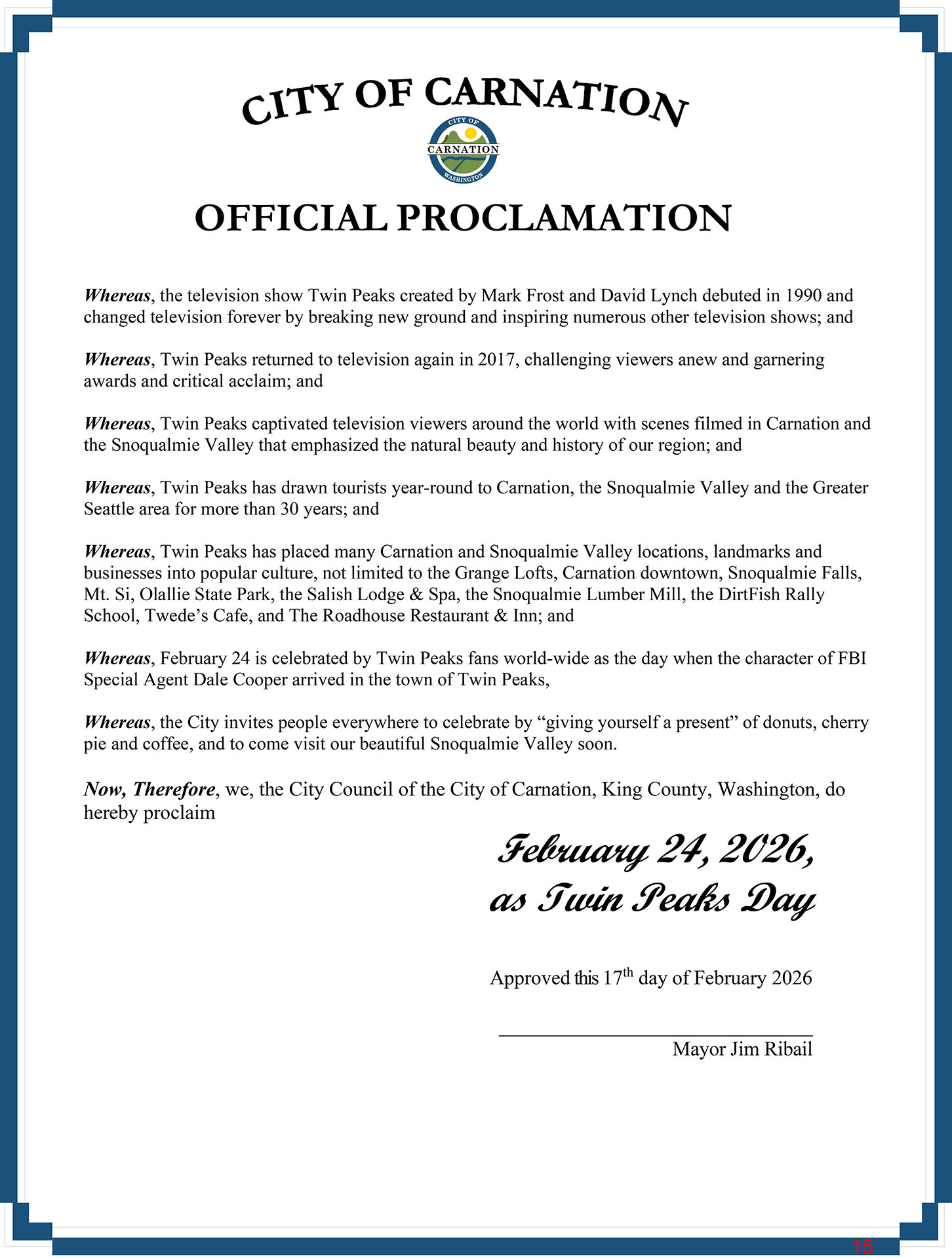 TWIN PEAKS DAY 2026 PROCLAMATION FOR CARNATION, WA