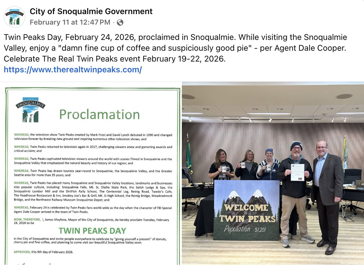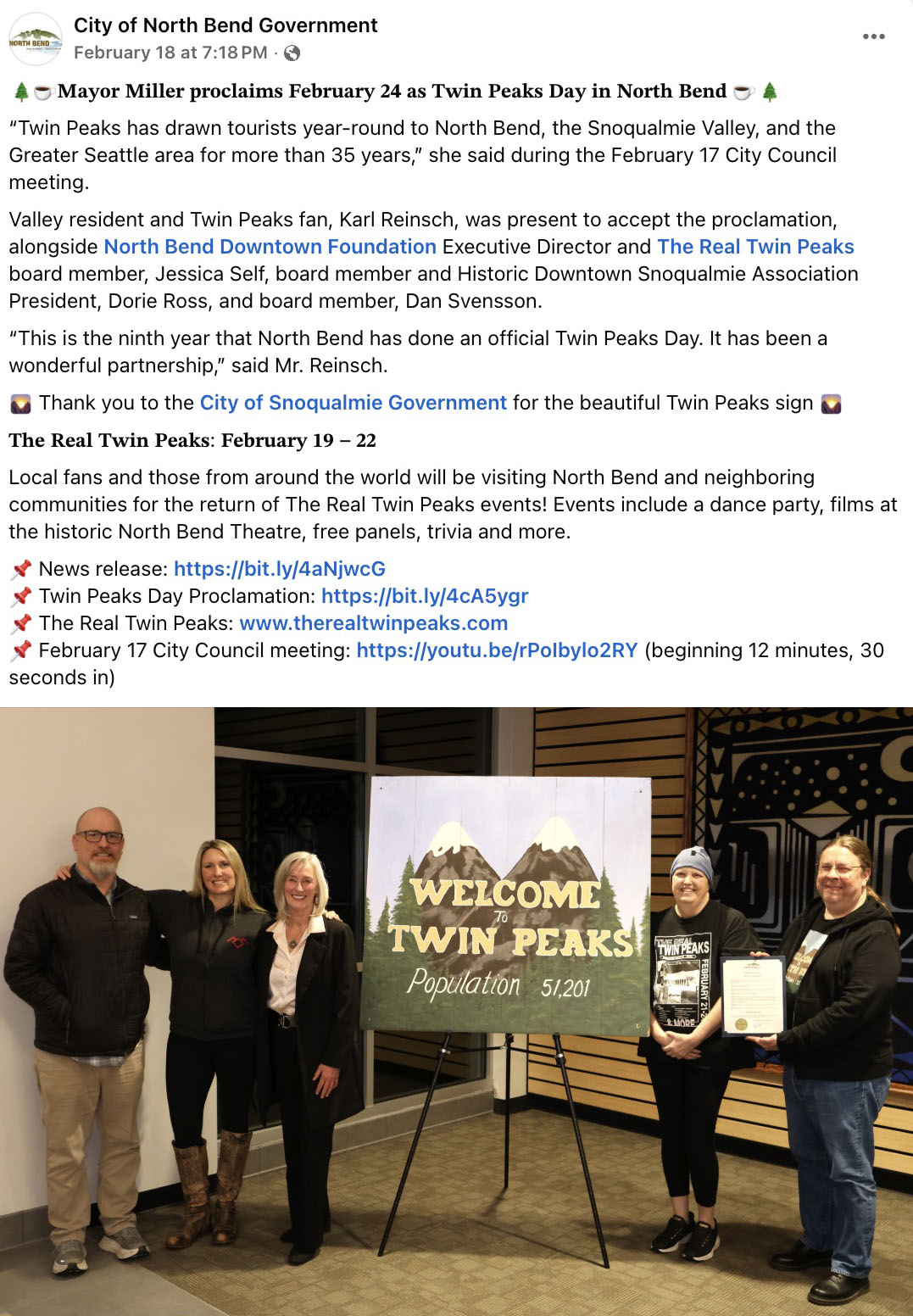 The Facebook page for the City of North Bend government also posted about Twin Peaks Day.