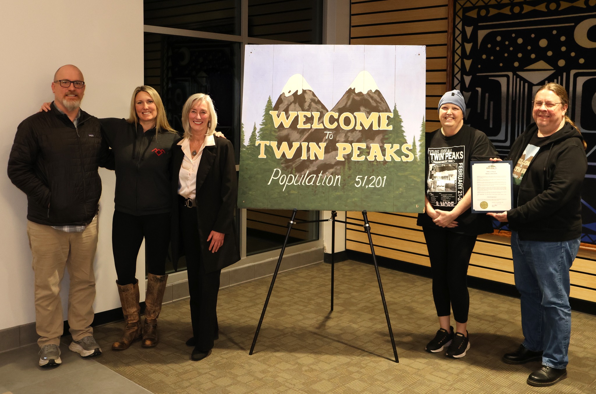 Valley resident and Twin Peaks fan, Karl Reinsch, was present to accept the proclamation, alongside North Bend Downtown Foundation Executive Director and The Real Twin Peaks board member, Jessica Self; board member and Historic Downtown Snoqualmie Association President, Dorie Ross, and board member, Dan Svensson.